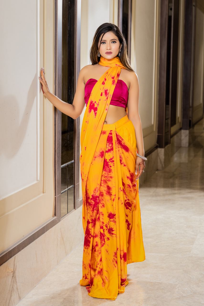 Marie -Mustard yellow tie and dye saree with rani pink bustier