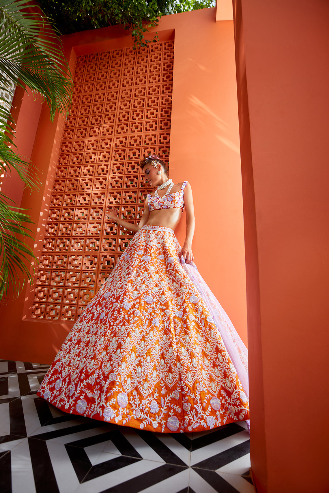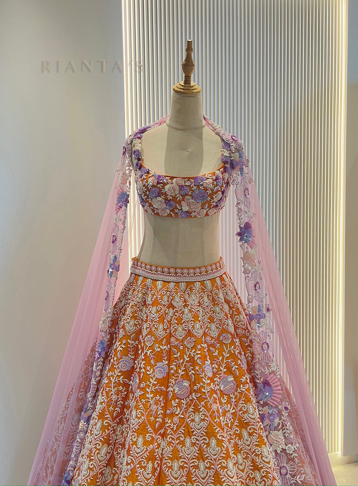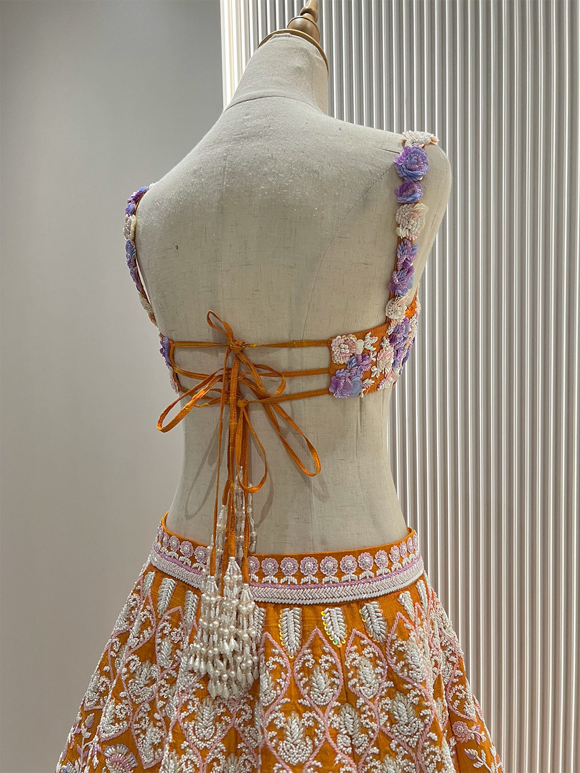 The Marigold Lehenga set is intricately embroidered pure raw silk. The lehenga is floral embroidered with colorful sequins, glass beads and our signature pearls and is paired with lavender embroidery on orange pure raw silk top. It comes with a soft net Lavender dupatta with floral embroidered borders.