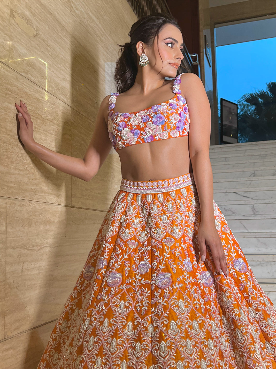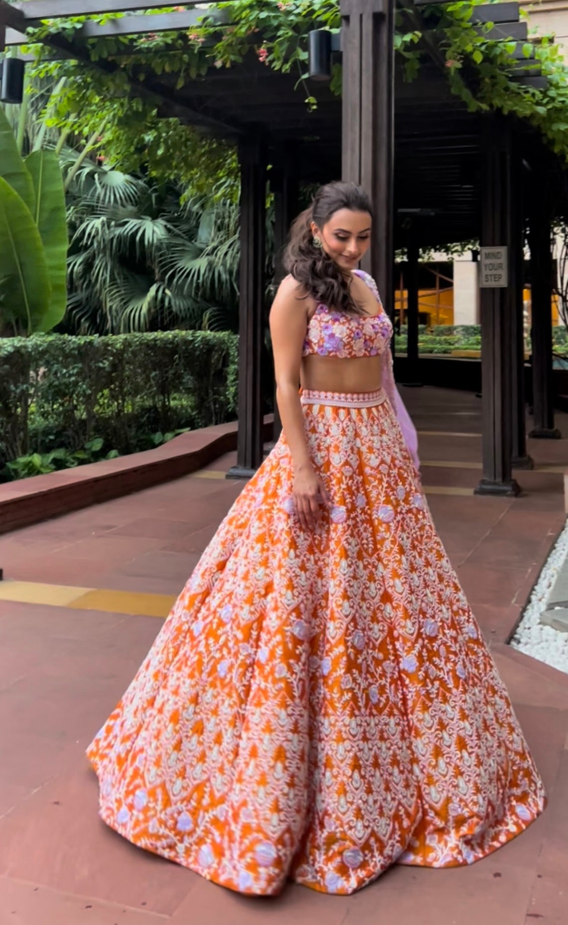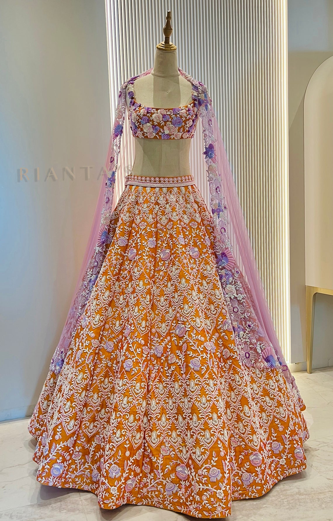 The Marigold Lehenga set is intricately embroidered pure raw silk. The lehenga is floral embroidered with colorful sequins, glass beads and our signature pearls and is paired with lavender embroidery on orange pure raw silk top. It comes with a soft net Lavender dupatta with floral embroidered borders.