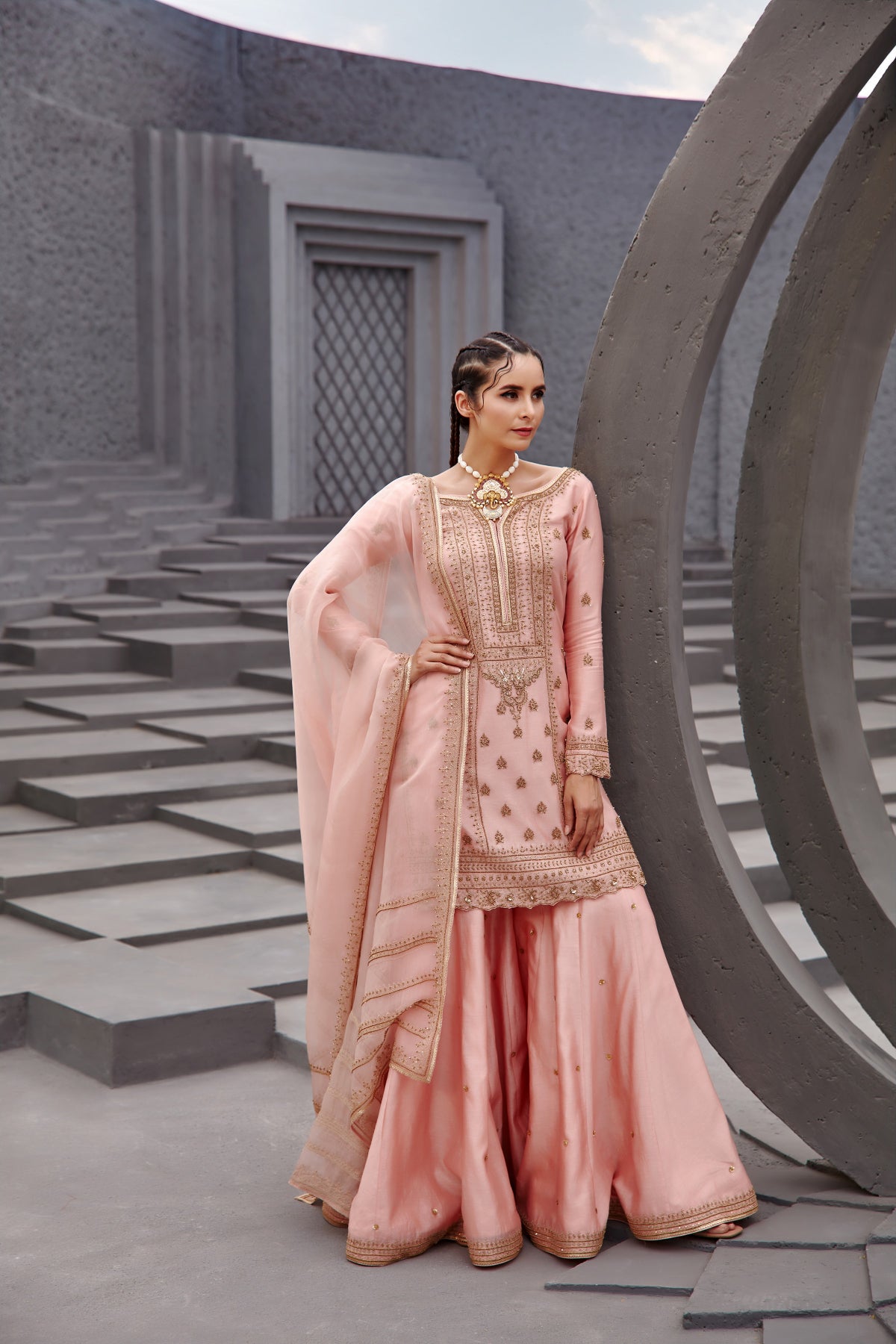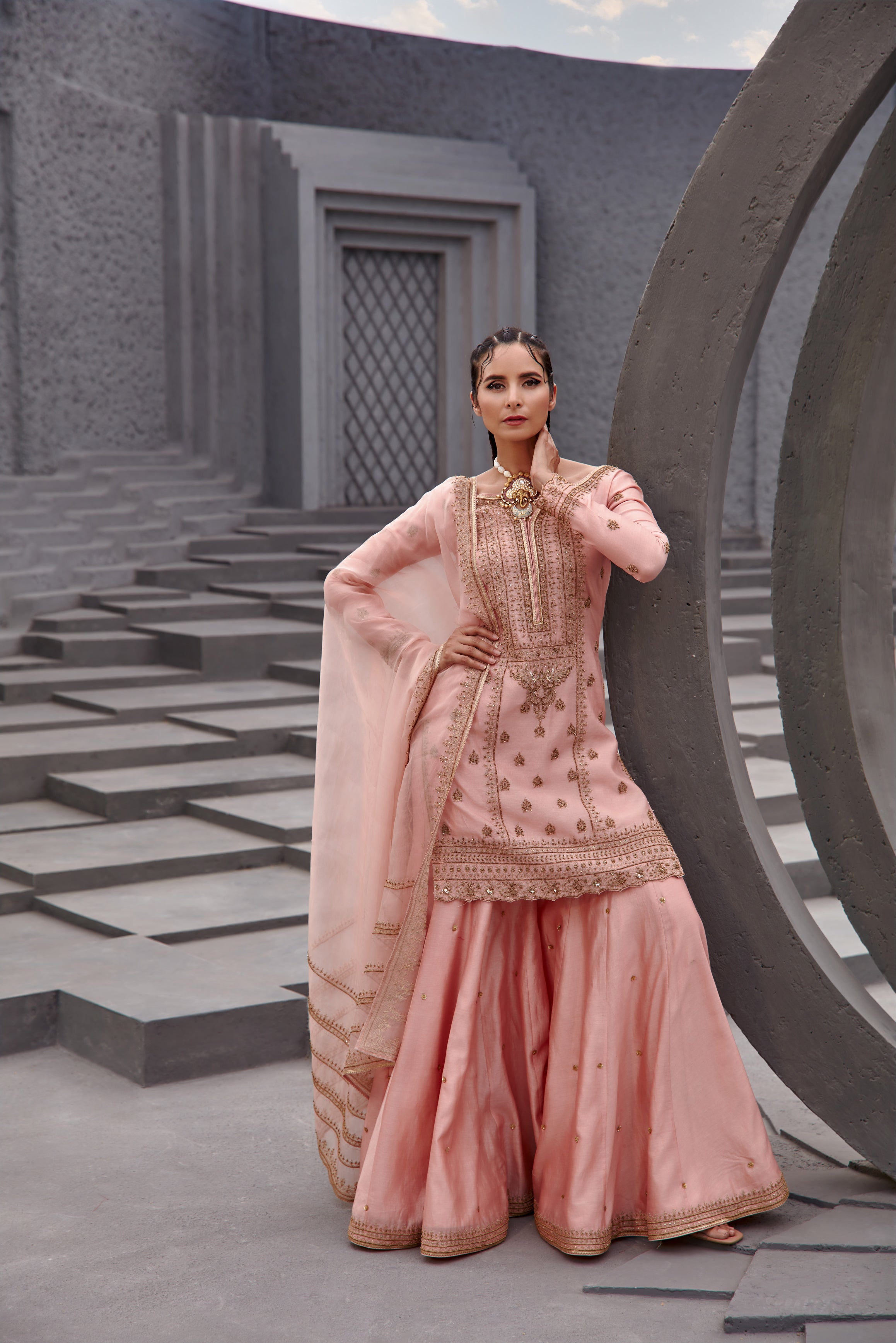 Featuring a mauve flared chanderi sharara kurta set paired with organza base dupatta with gold dori and aari embroidery on it.