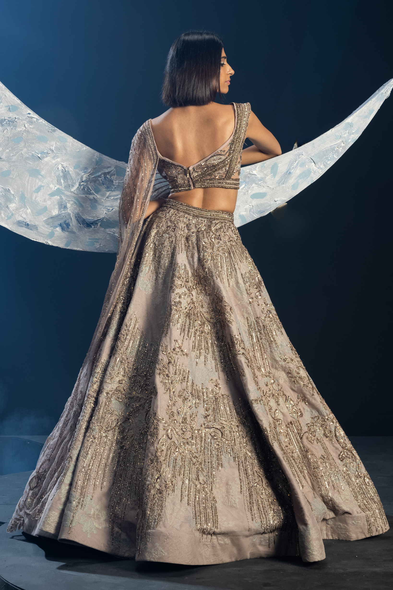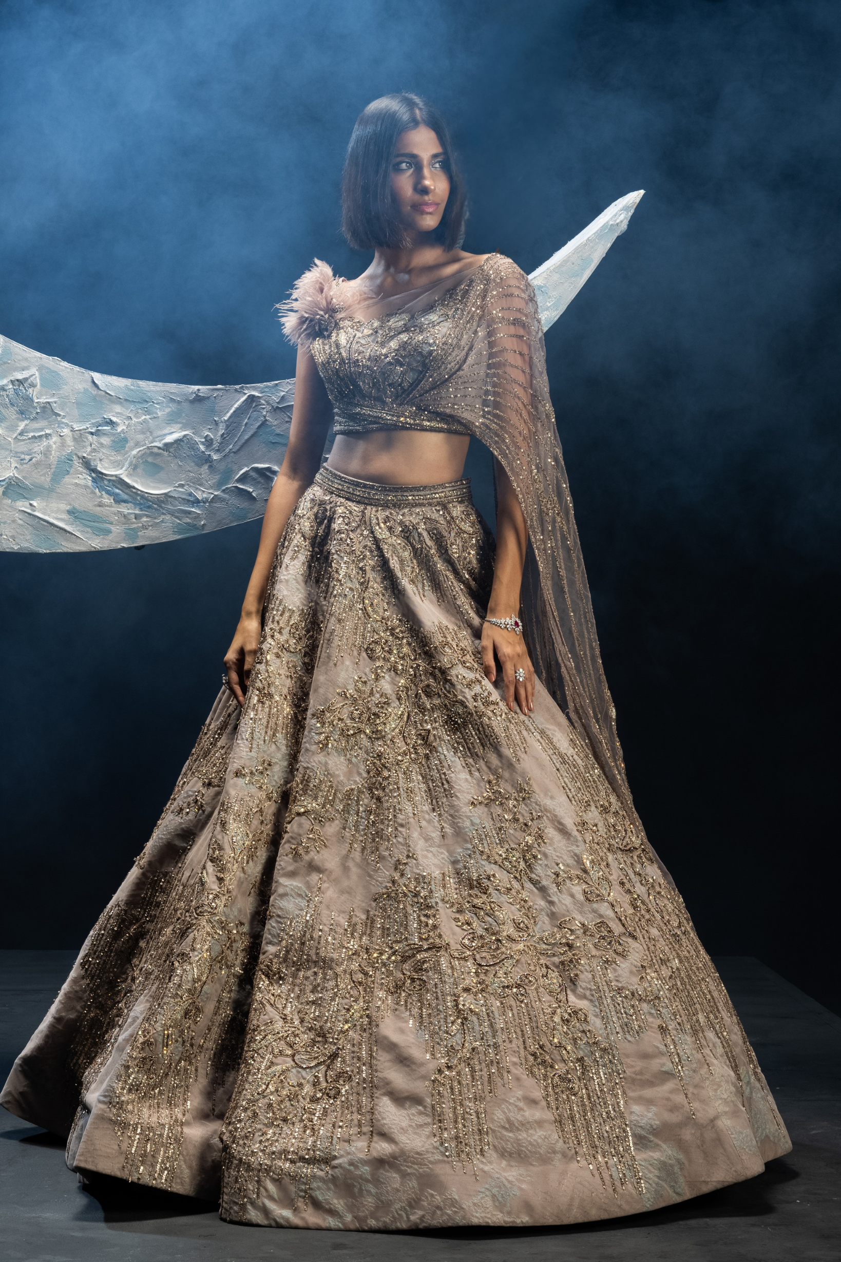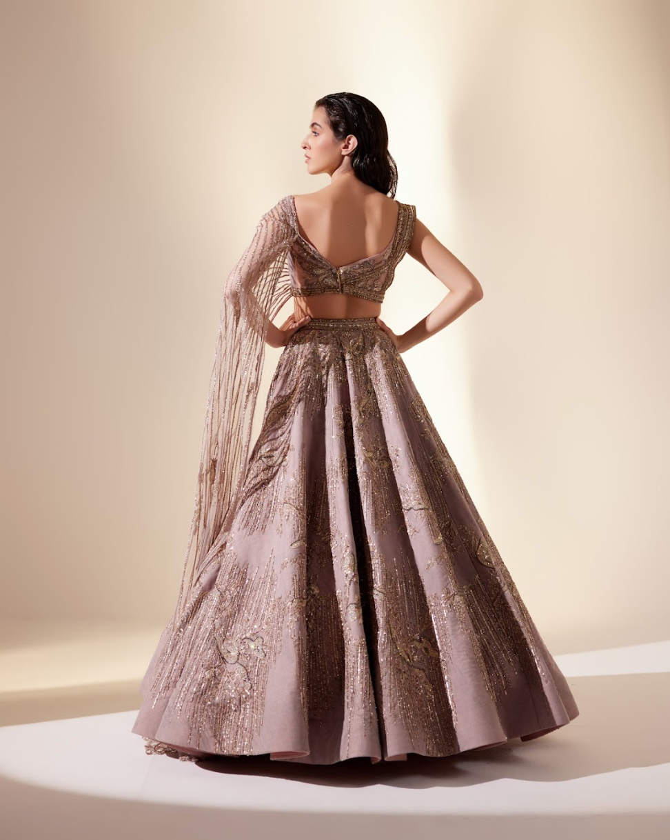 Rose Gold Top with attached dupatta and bejeweled delicately embellished skirt in a linear pattern.