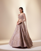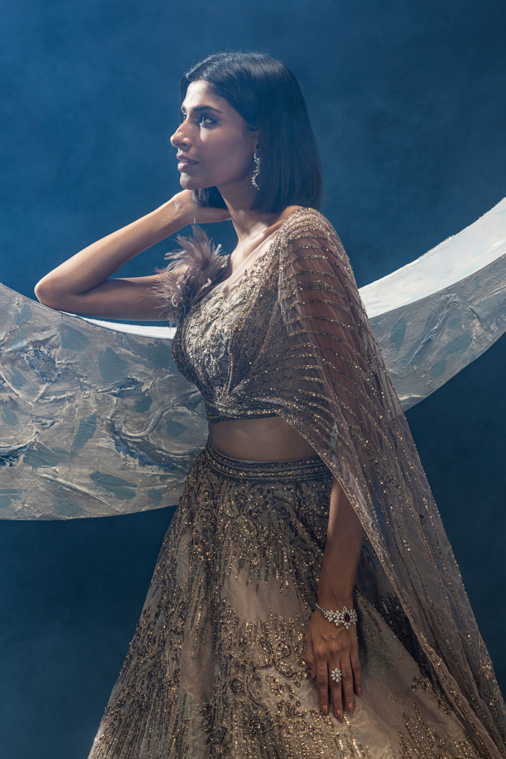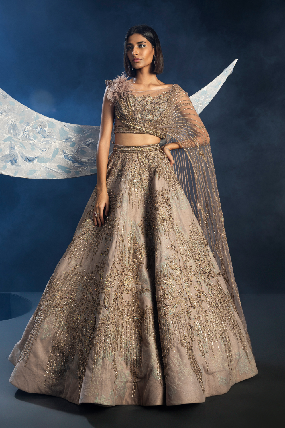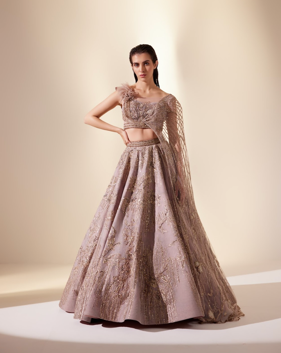 Rose Gold Top with attached dupatta and bejeweled delicately embellished skirt in a linear pattern.