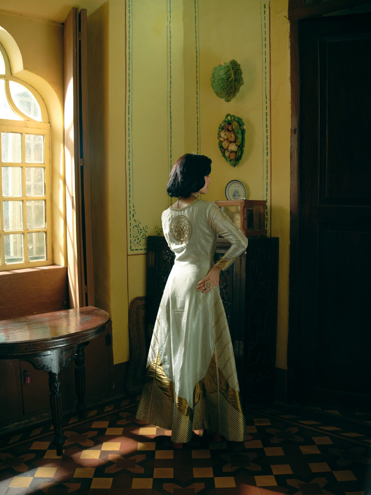 This Kalidar Anarkali set in pearl gold silk zari tissue and Jacquard silk Banarasi features Jharokha-inspired panels with gota texturing and elongated paisley embroidery in zari and zardozi. The ensemble is completed with a pearl gold tissue dupatta, adorned with Jharokha-inspired panels and pearl detailing.