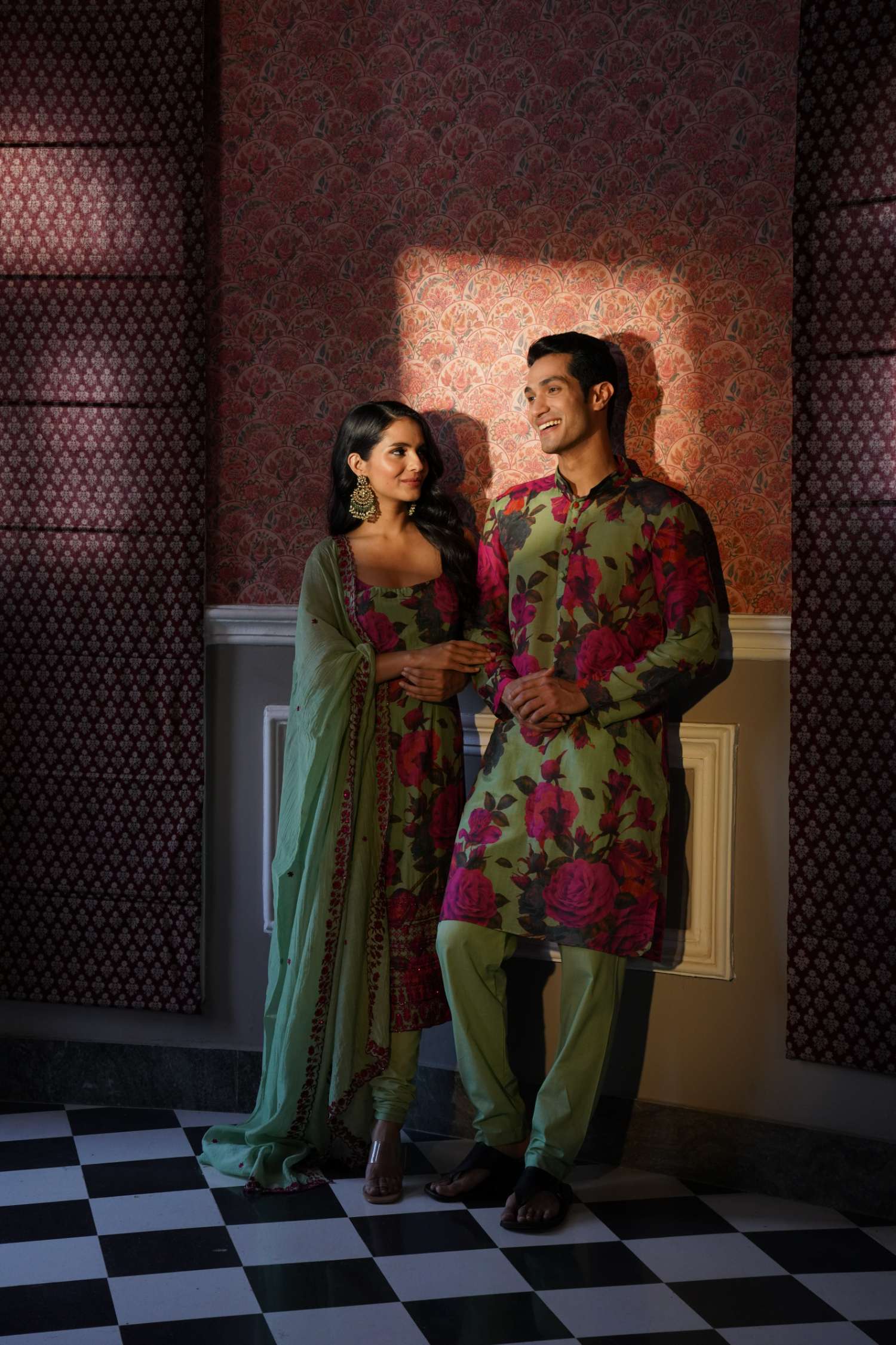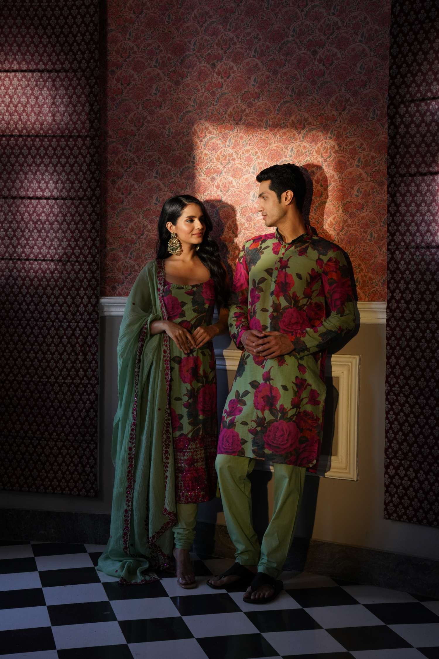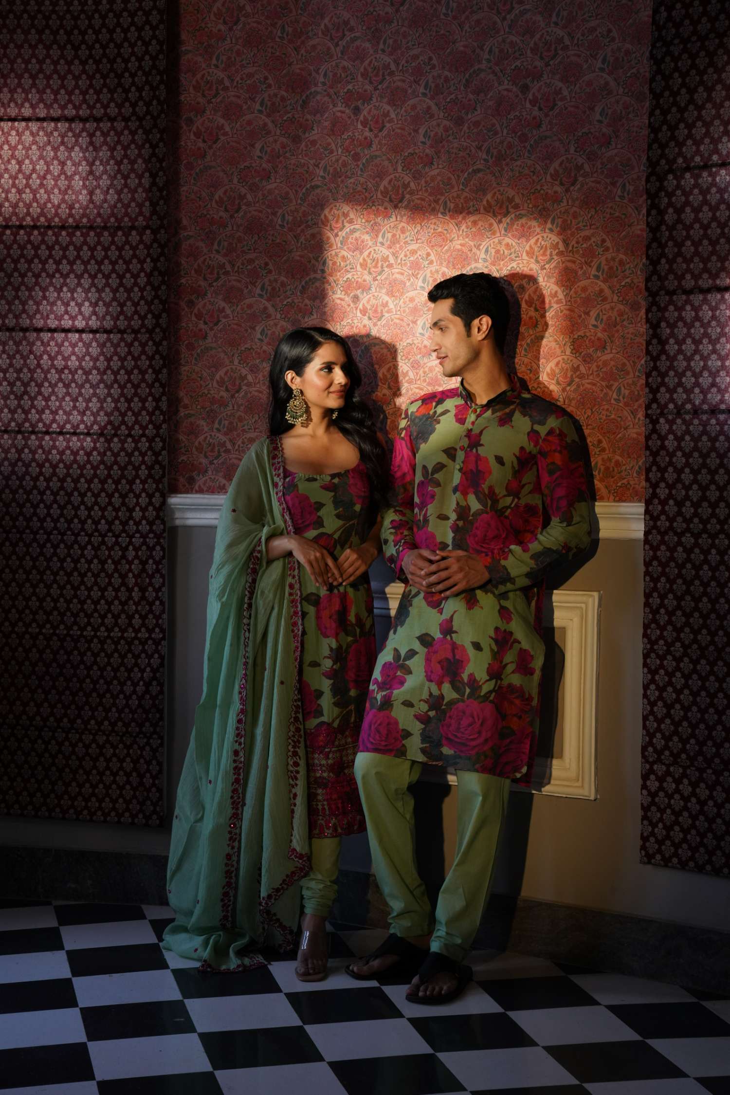 Featuring a Mehendi Green Floral Kurti Set in CHANDERI SILK.