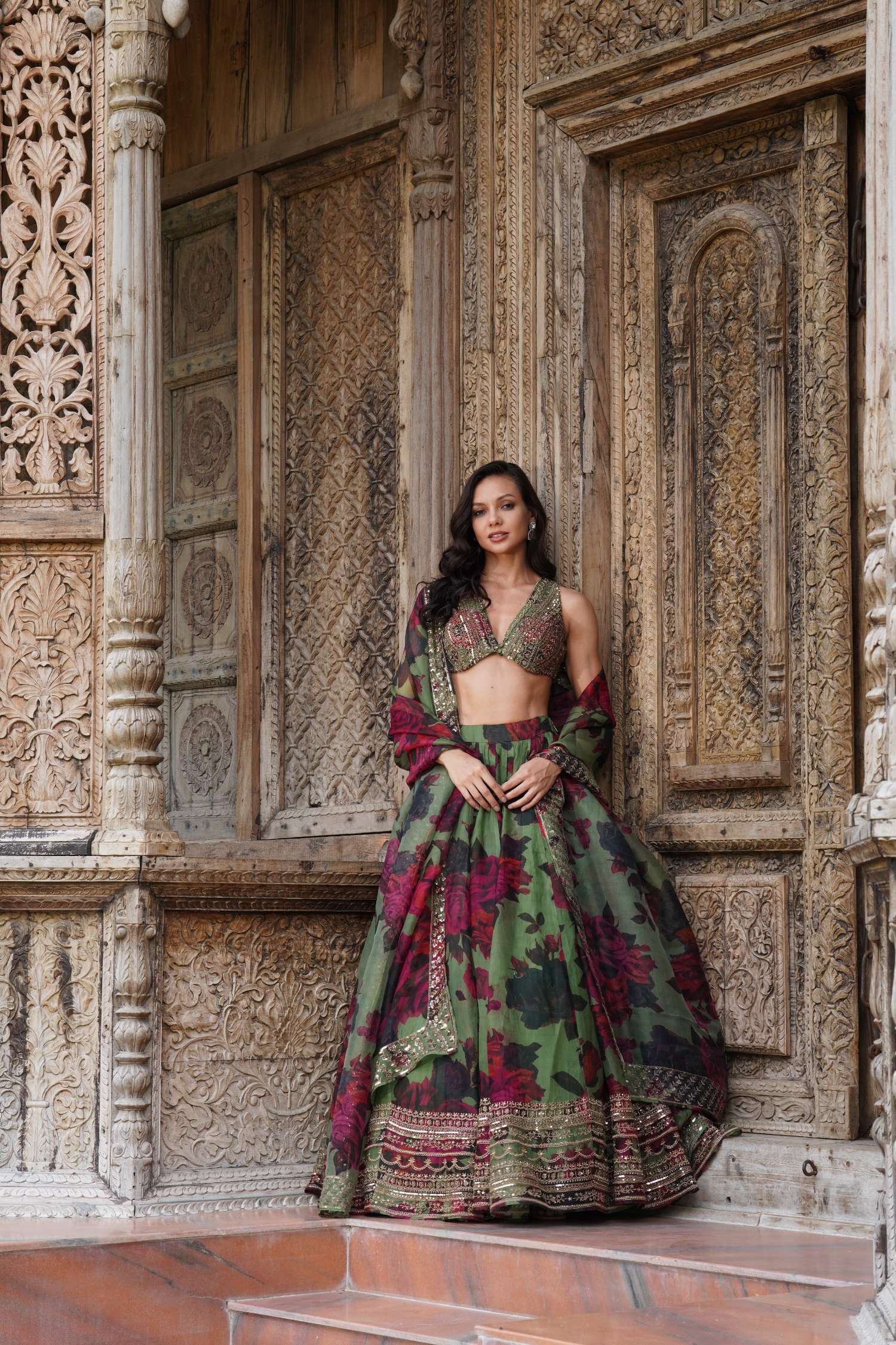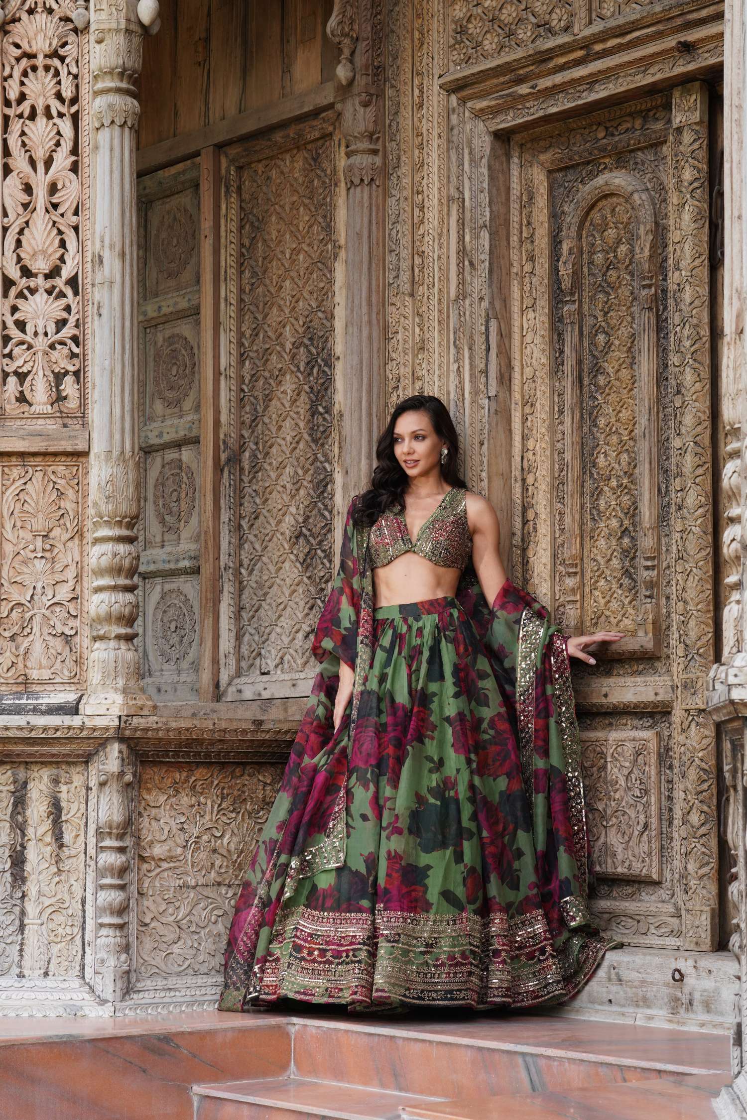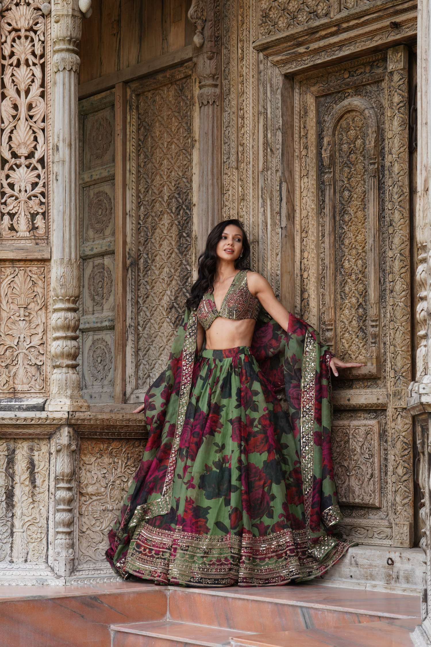Featuring a Mehendi Green Floral Lehenga Set in Organza.