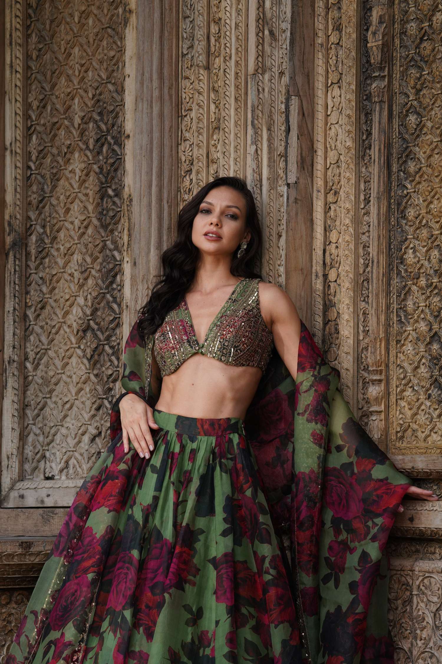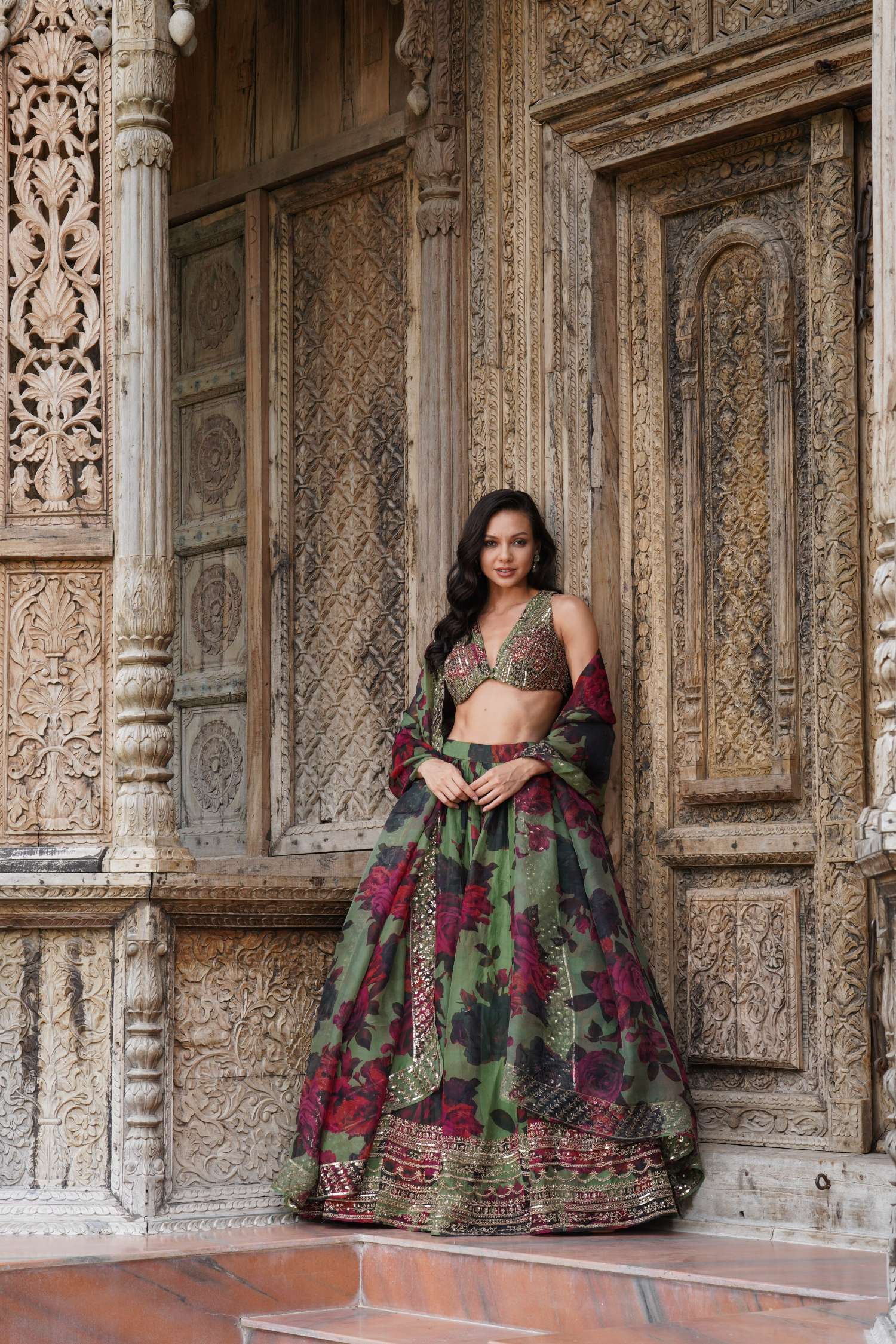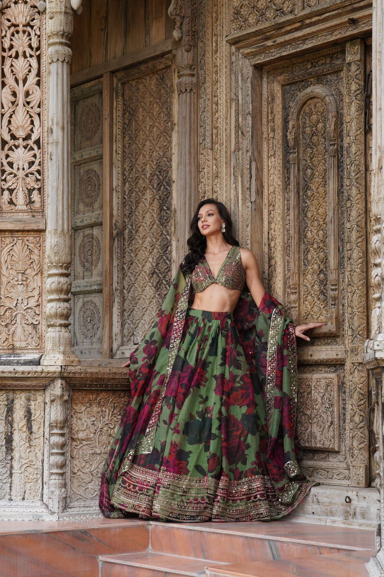 Featuring a Mehendi Green Floral Lehenga Set in Organza.