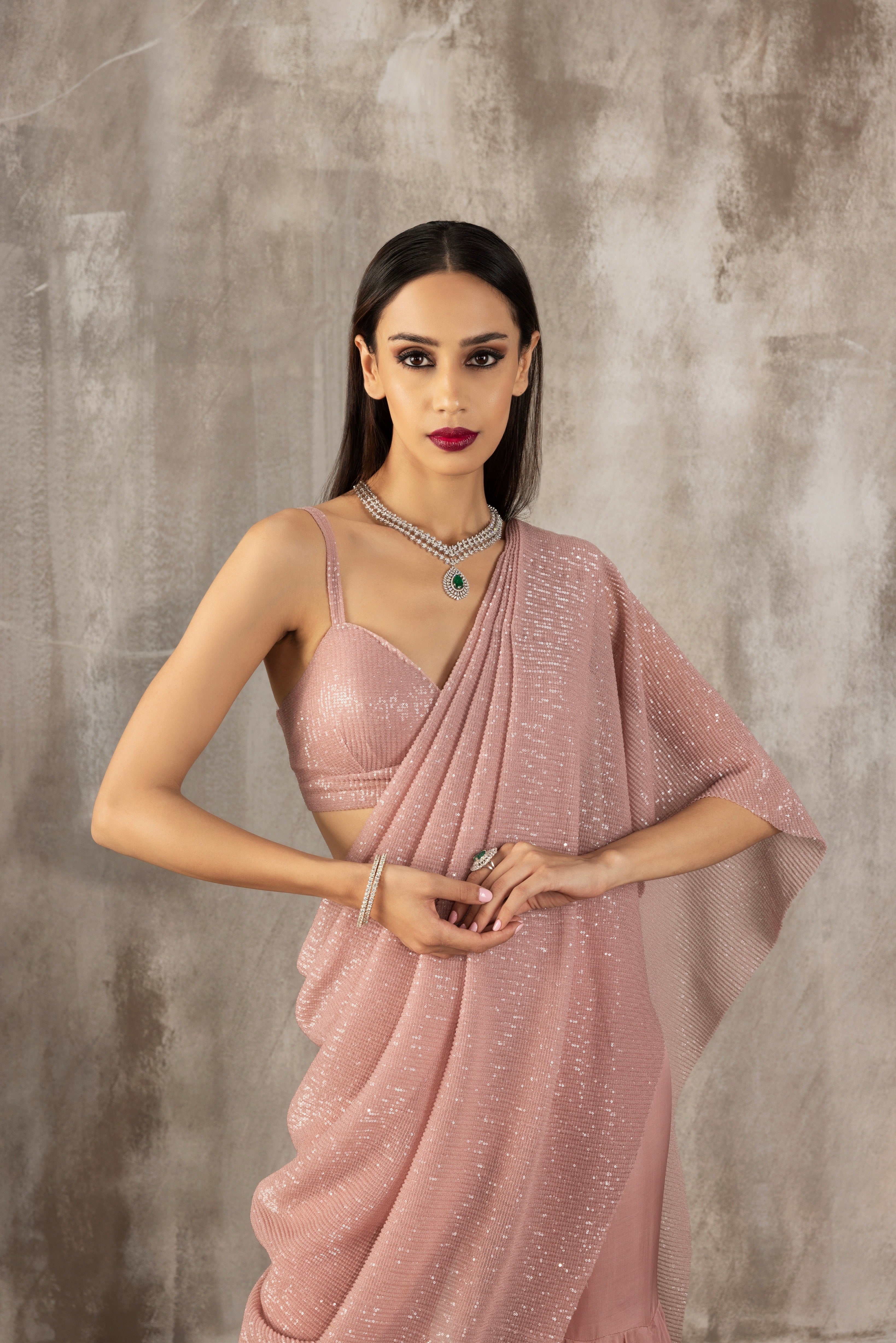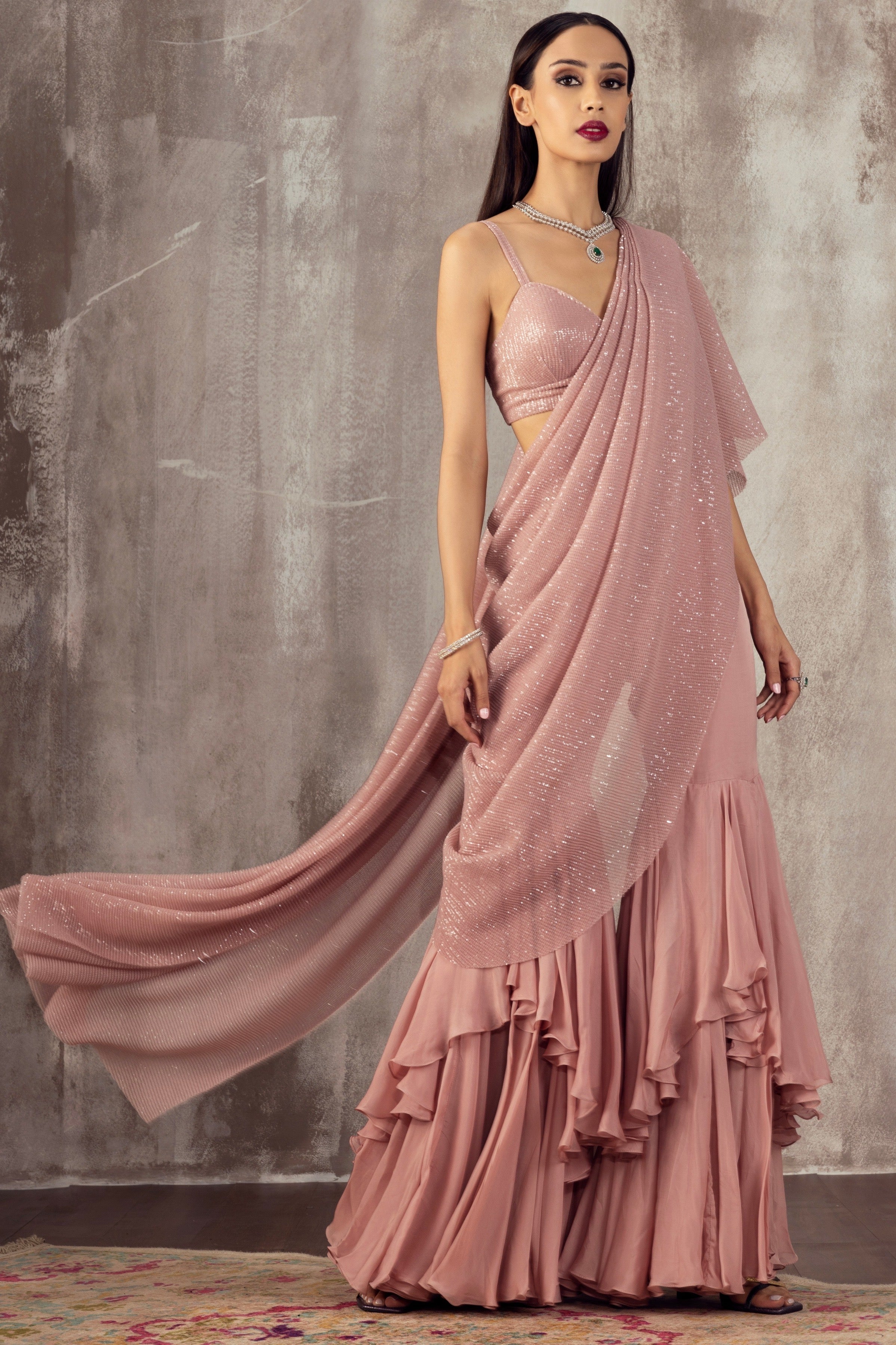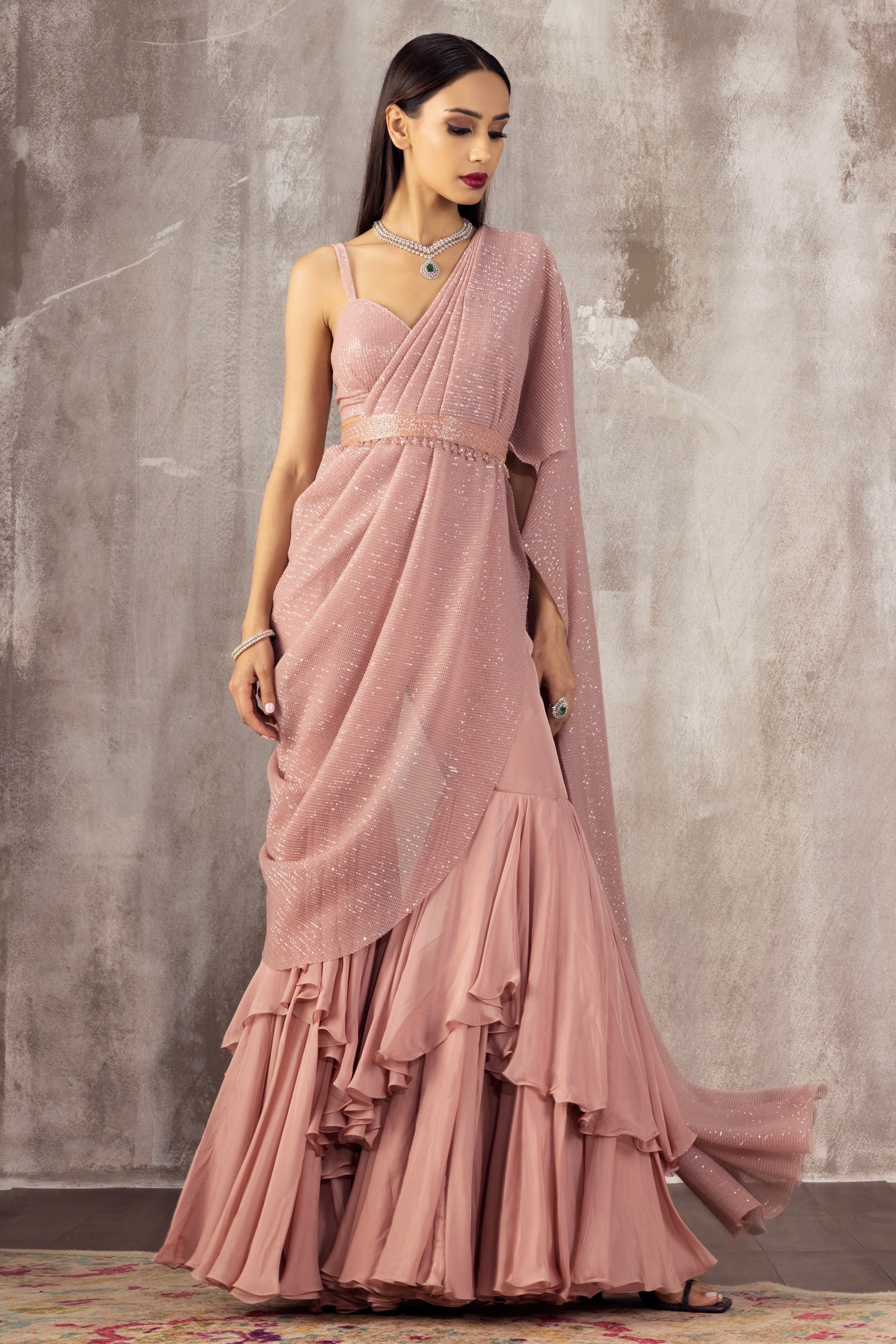 Featuring a meher pink sequined chiffon sharara set paired with a sequined bustier and sequined draped dupatta with a hand embroidered belt