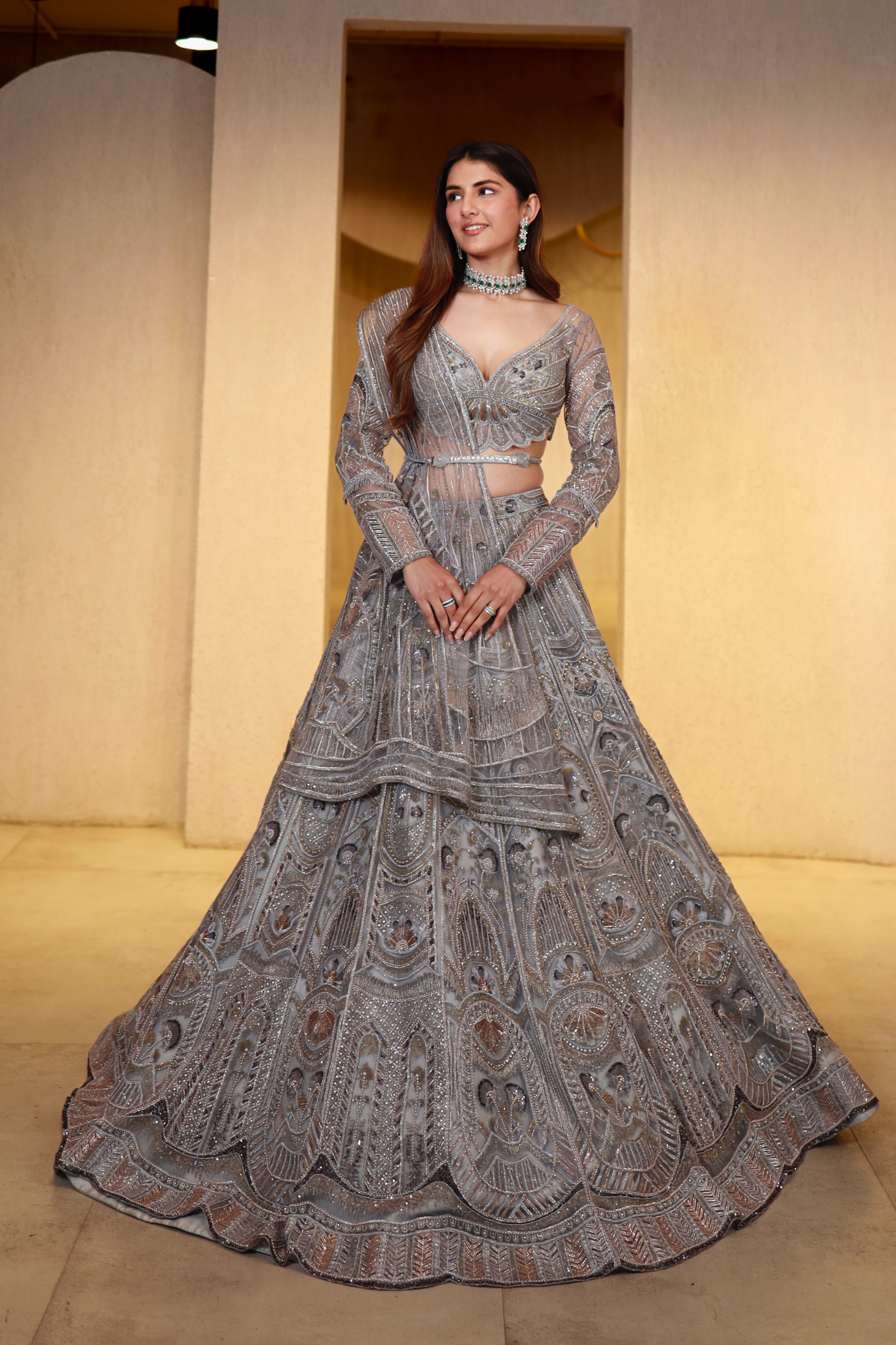 Metallic Blush lehenga with rhythmic floral embroidery. Comes with a dupatta.