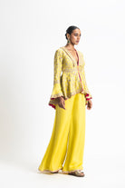 Mehndi Yellow Gota-Worked Jacket With Peplum And Contrasting Pink Backing On The Scallop Of The Jacket, Paired With Satin Trousers.