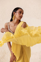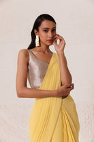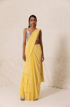 A yellow draped tiered saree adorned with rhinestones and elevated by a brocade blouse adorned with rhinestone embellishments on the neckline, creating a captivating fusion of textures and sparkle that exudes modern elegance and opulence.