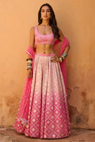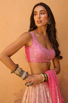 Zardosi and pearl embroidered blouse with jacquard skirt and a tulle dupatta.