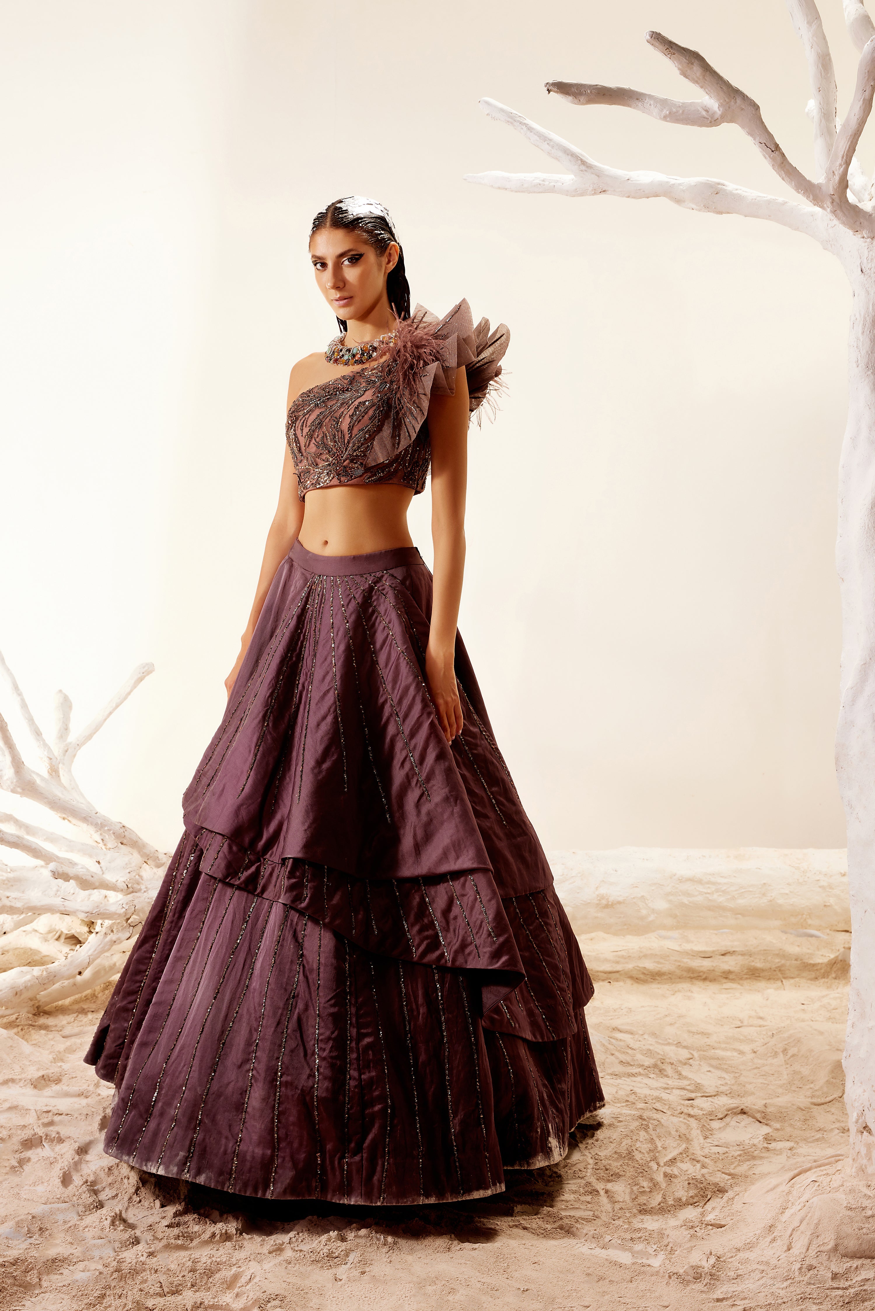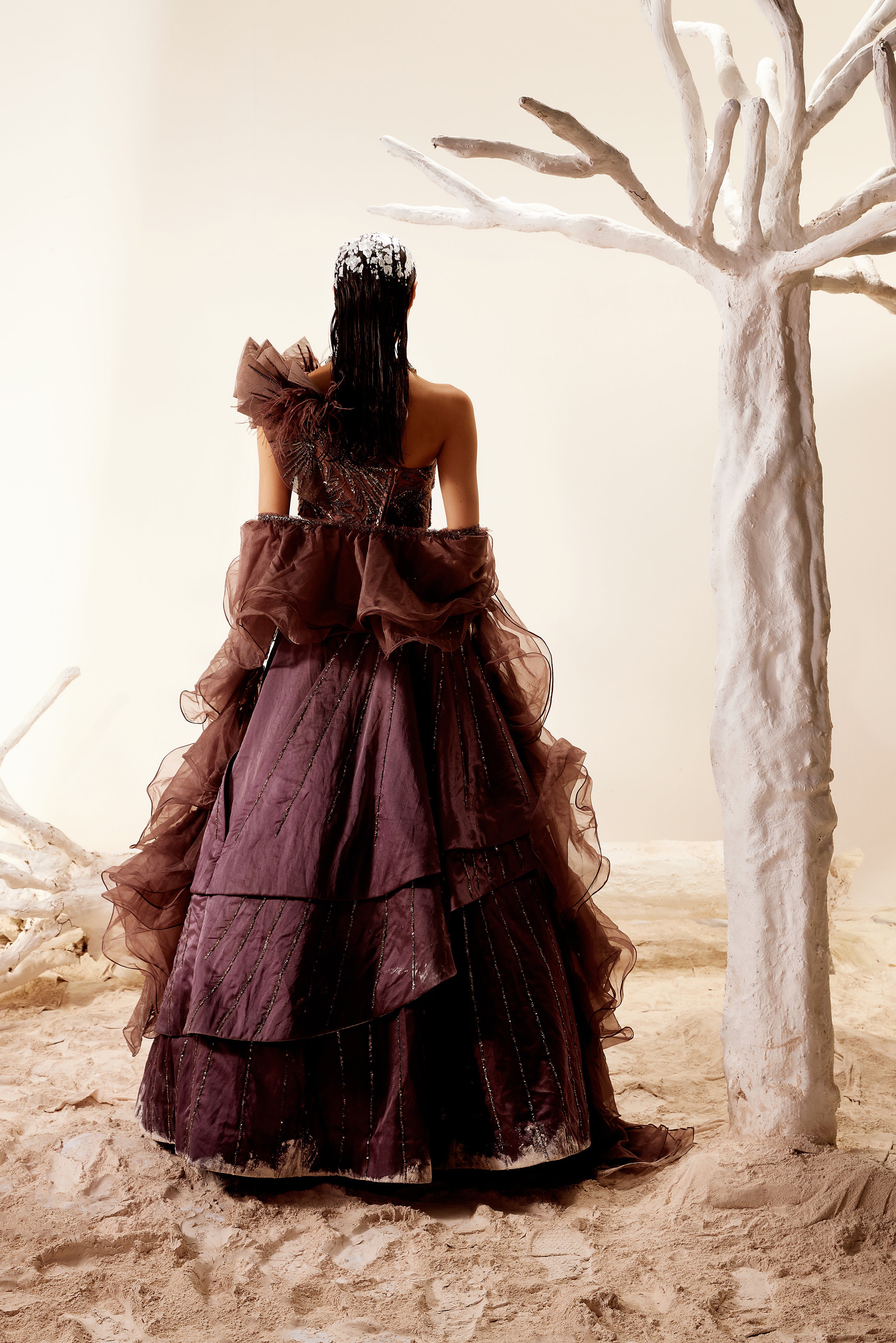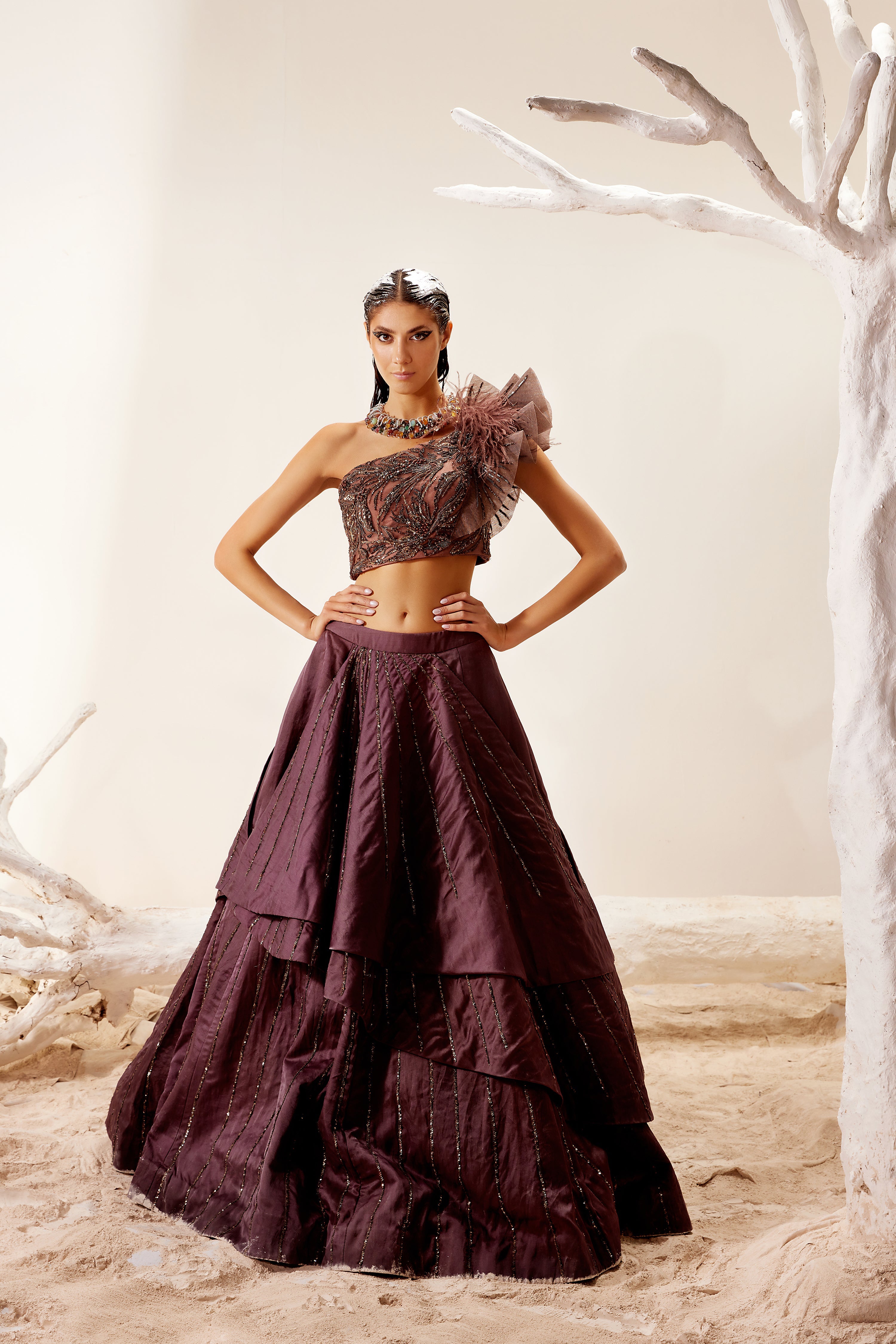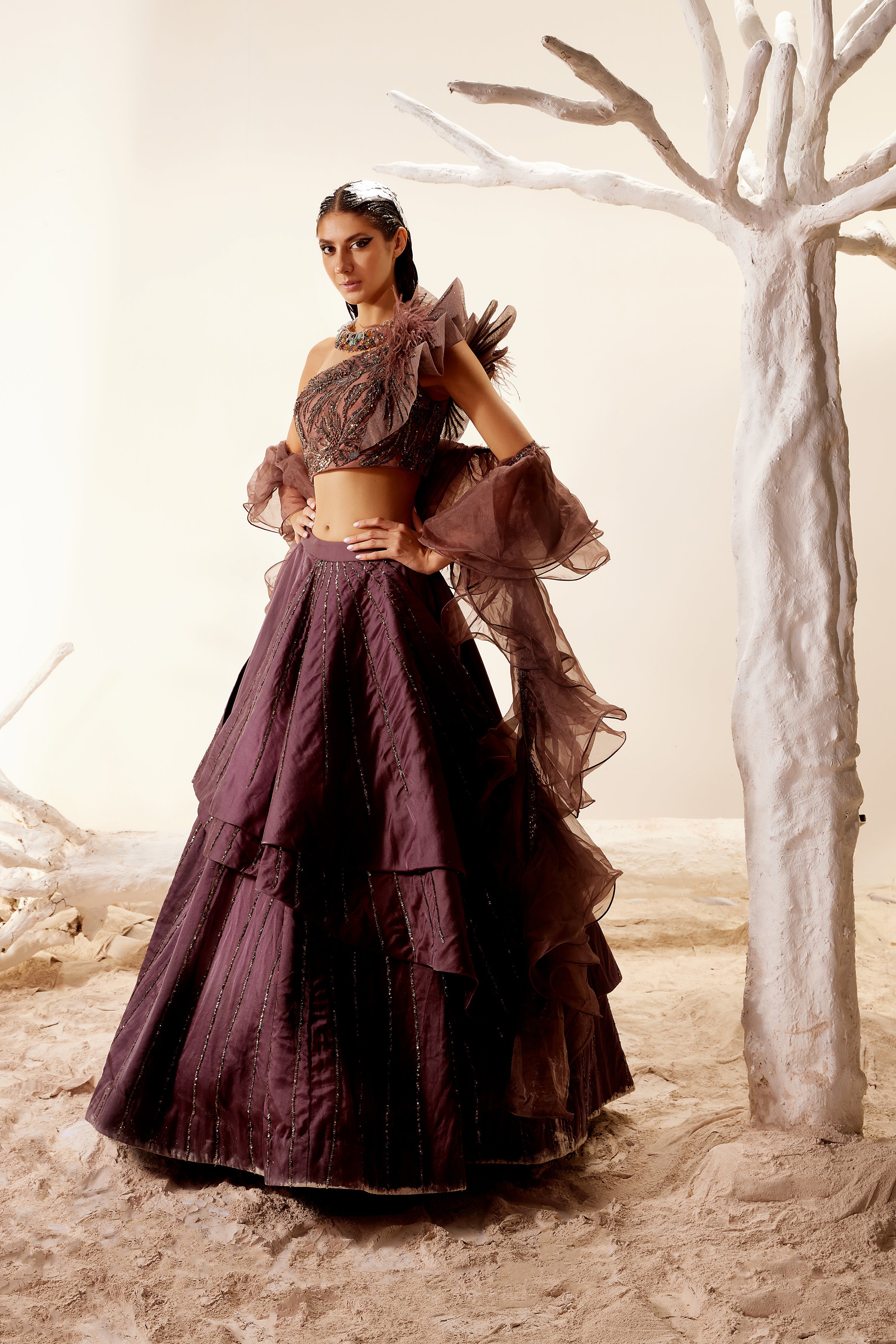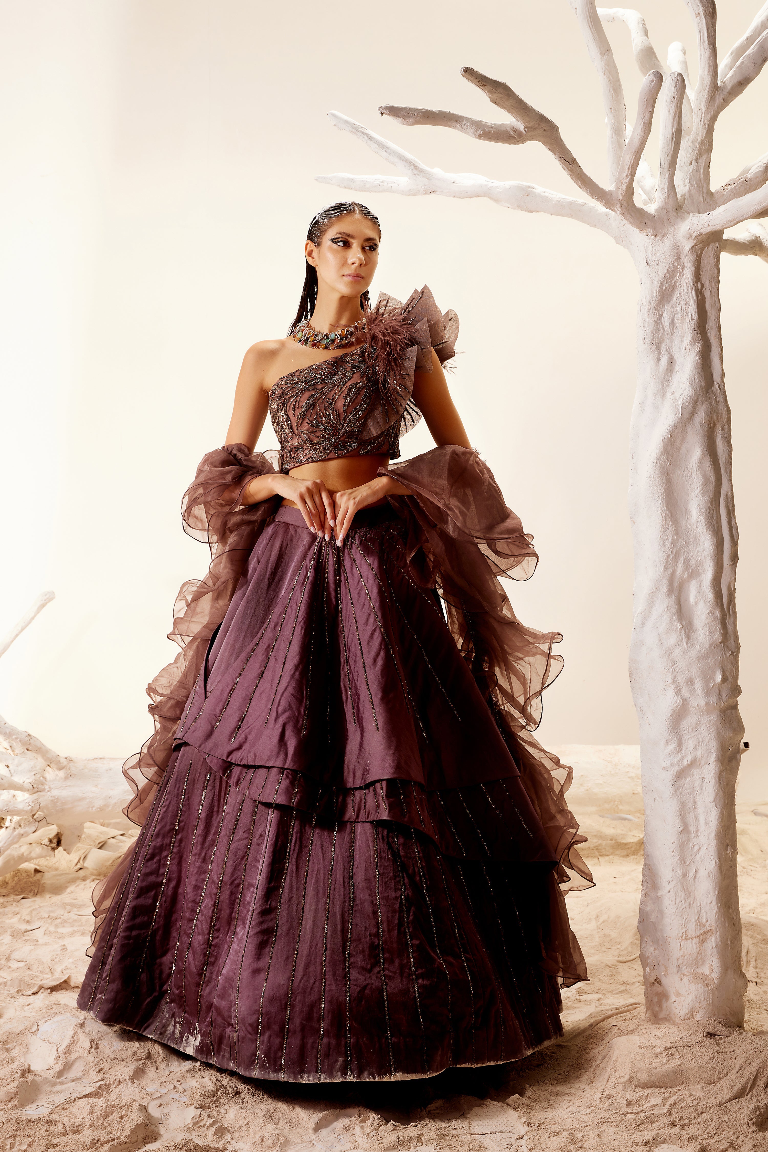 Satin Brown melted floral embroidery spiked shoulder top with asymmetric organza skirt