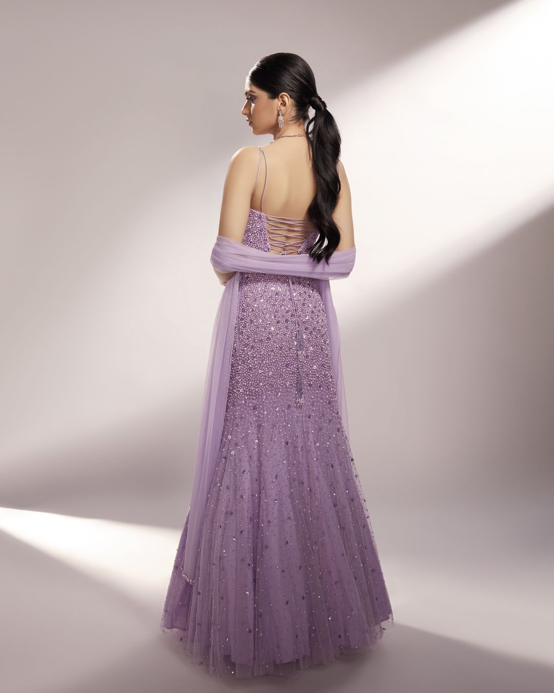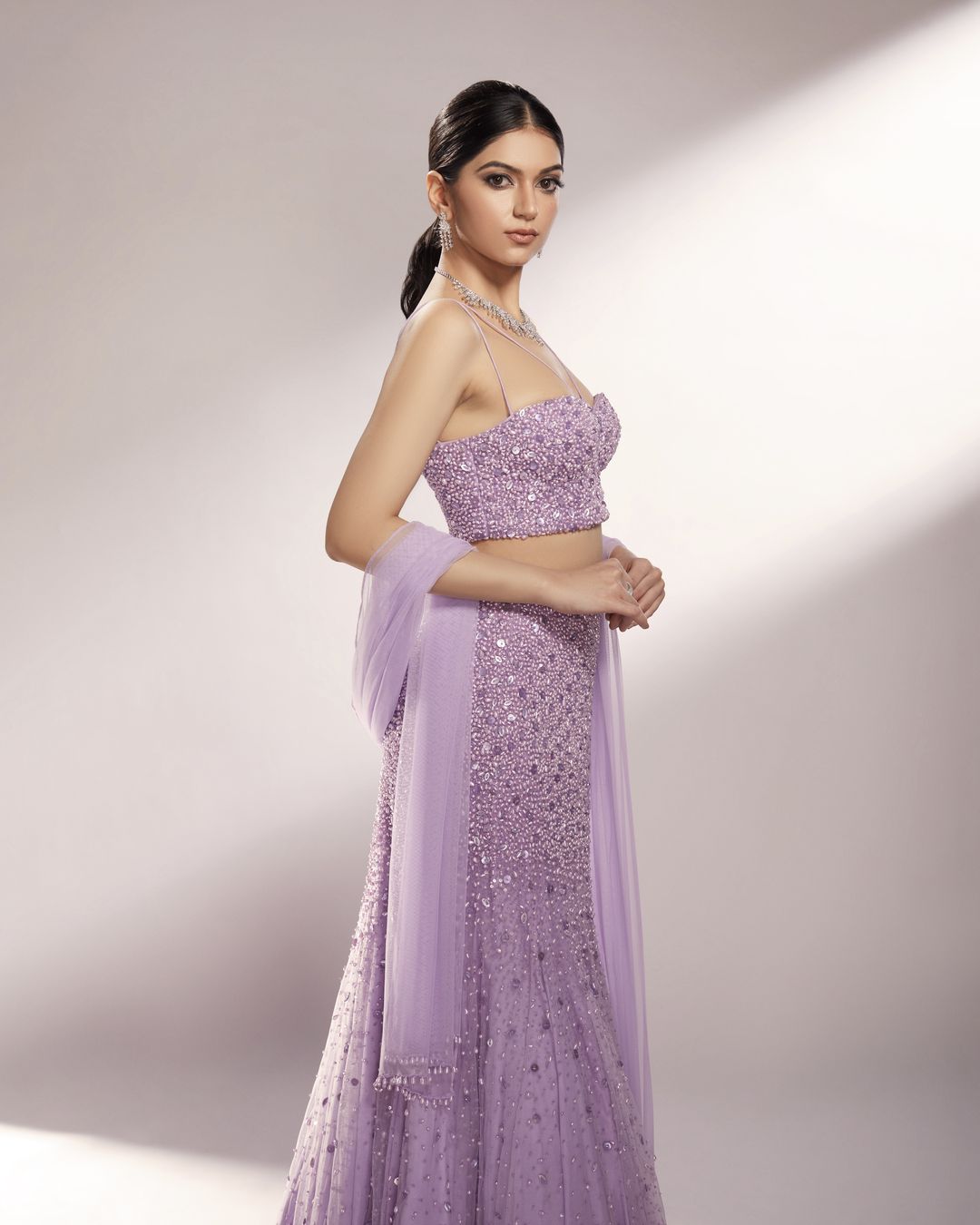 A lilac fishtail lehenga and corset blouse set, heavily embellished with pearls, glass beads and mother of pearl shells.