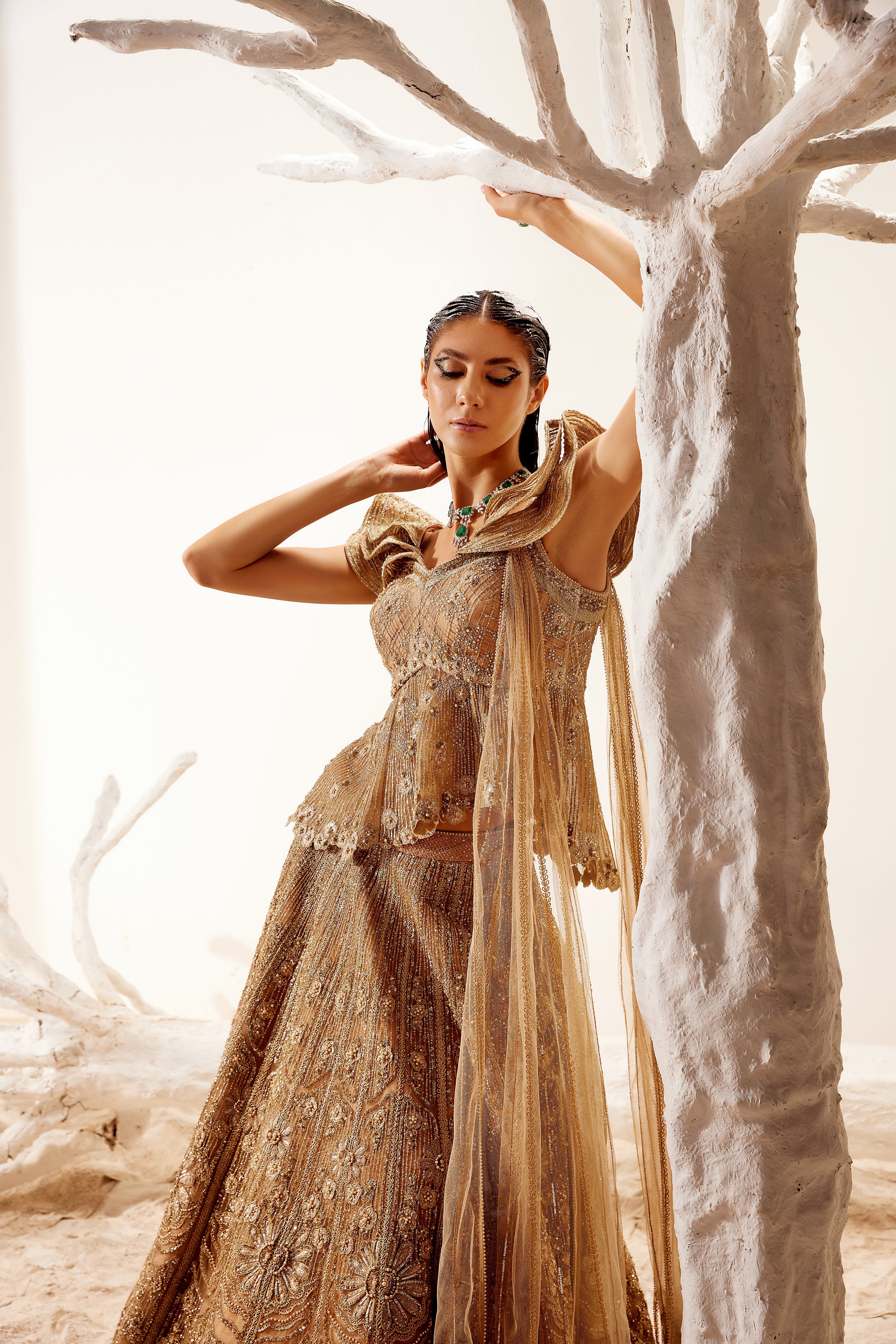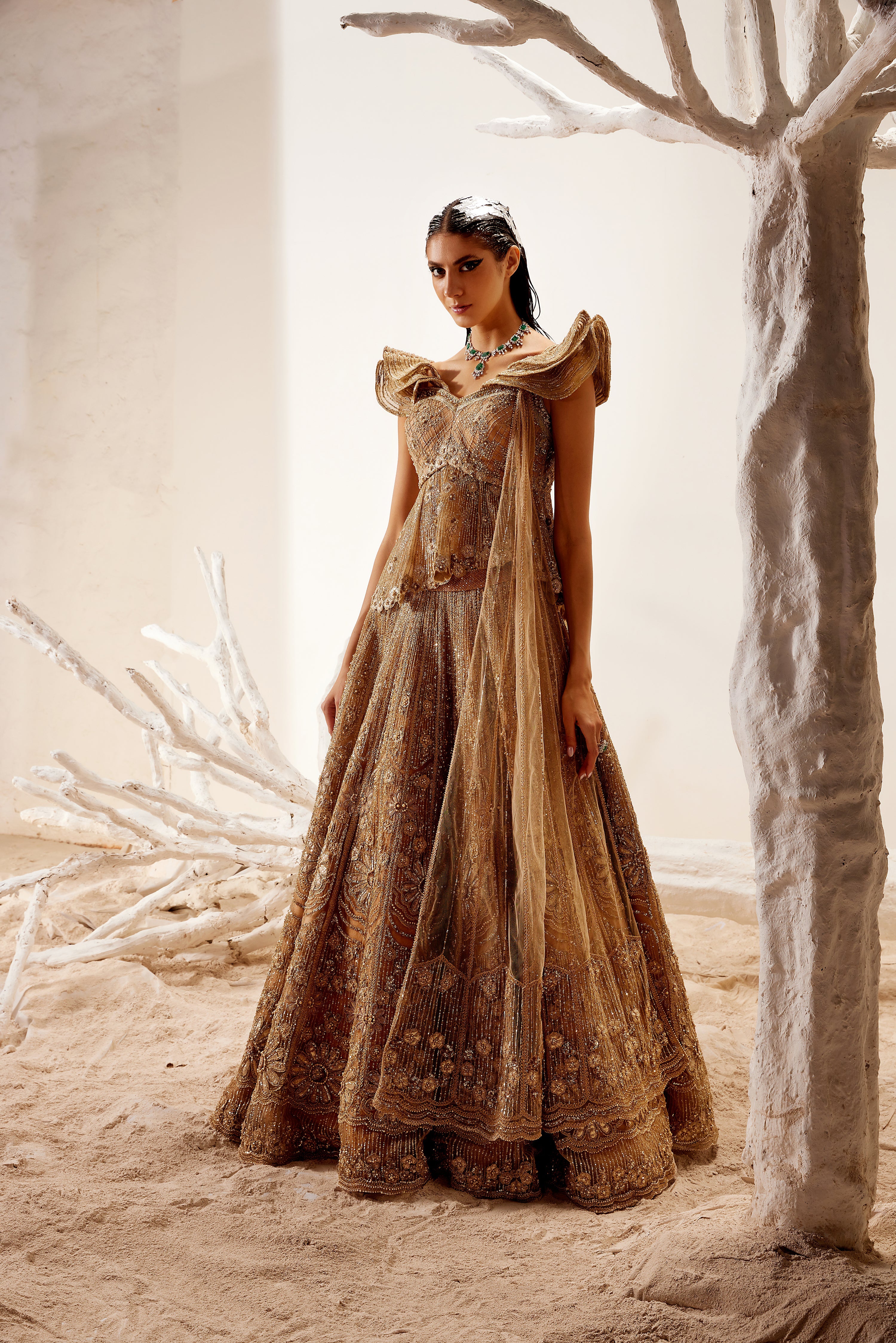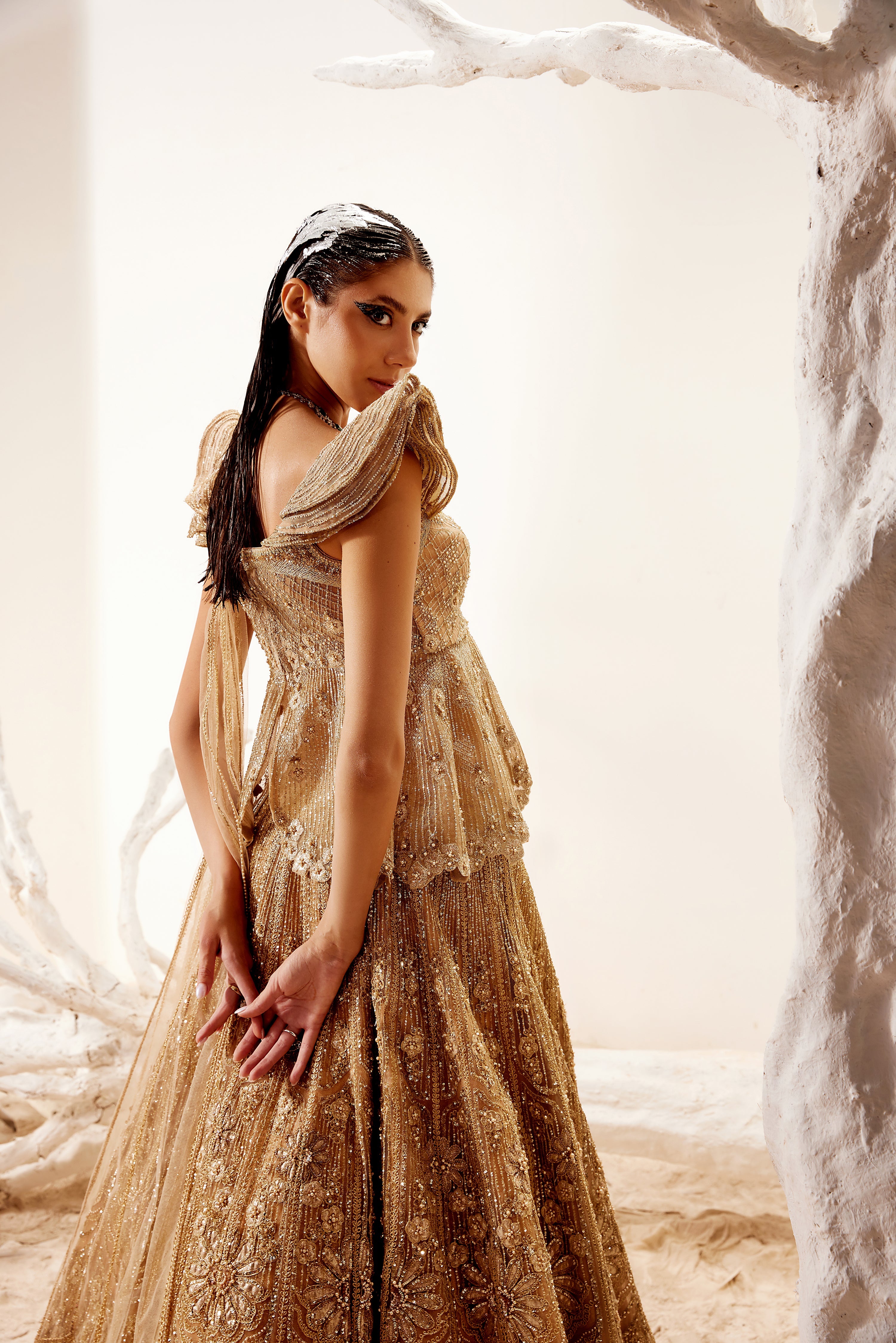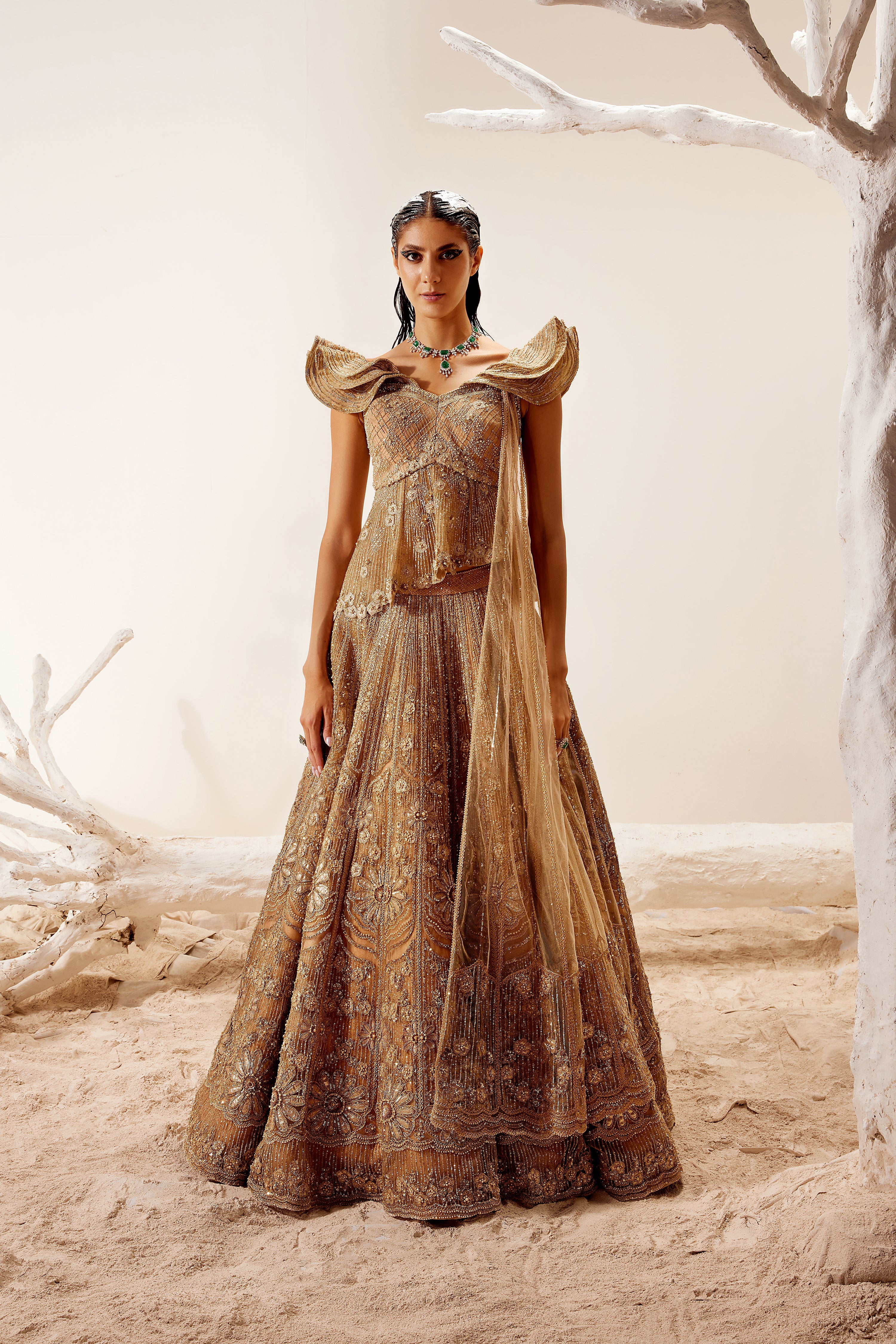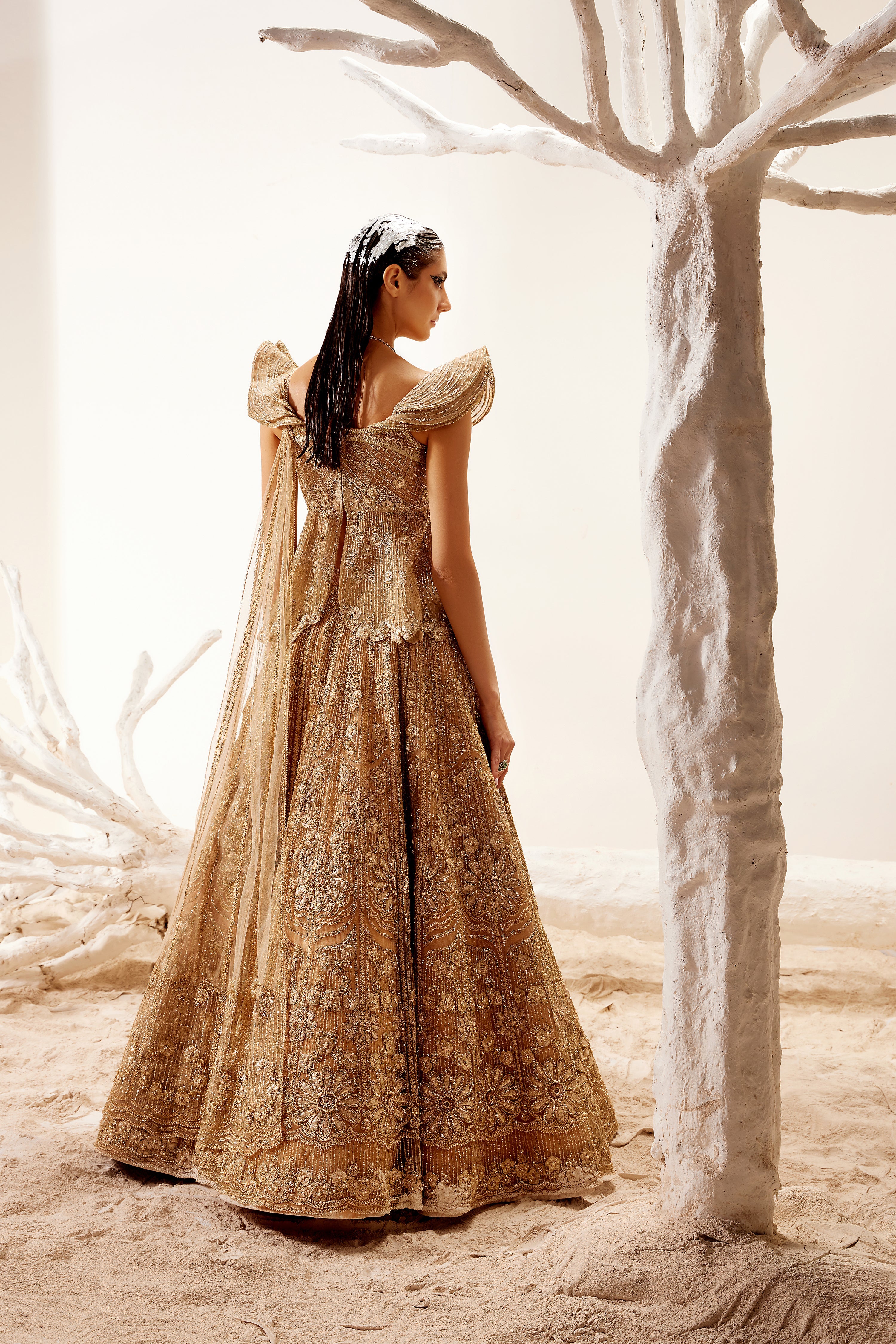 Metallic floral detail lehenga with cold shoulder peplum blouse and dupatta.