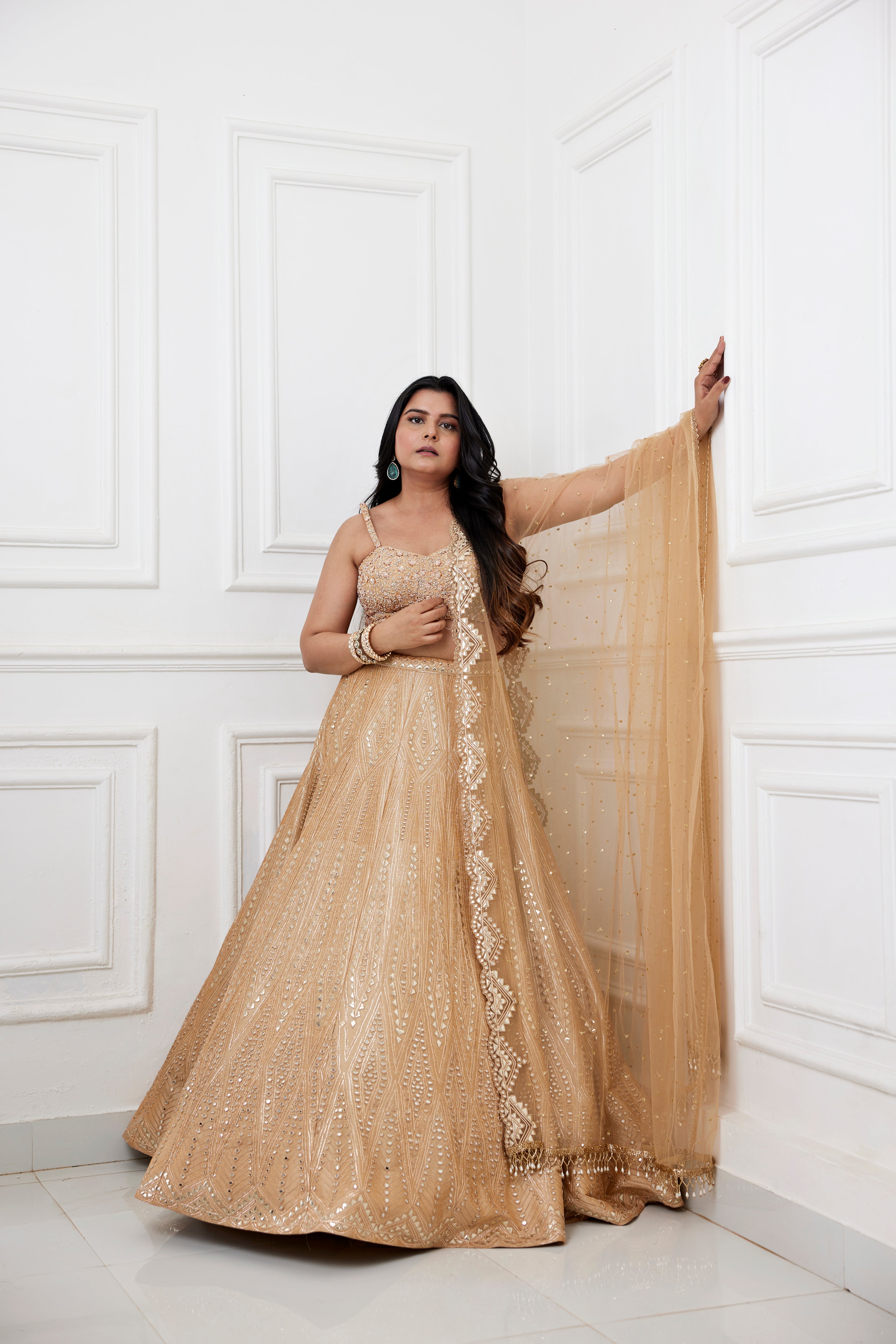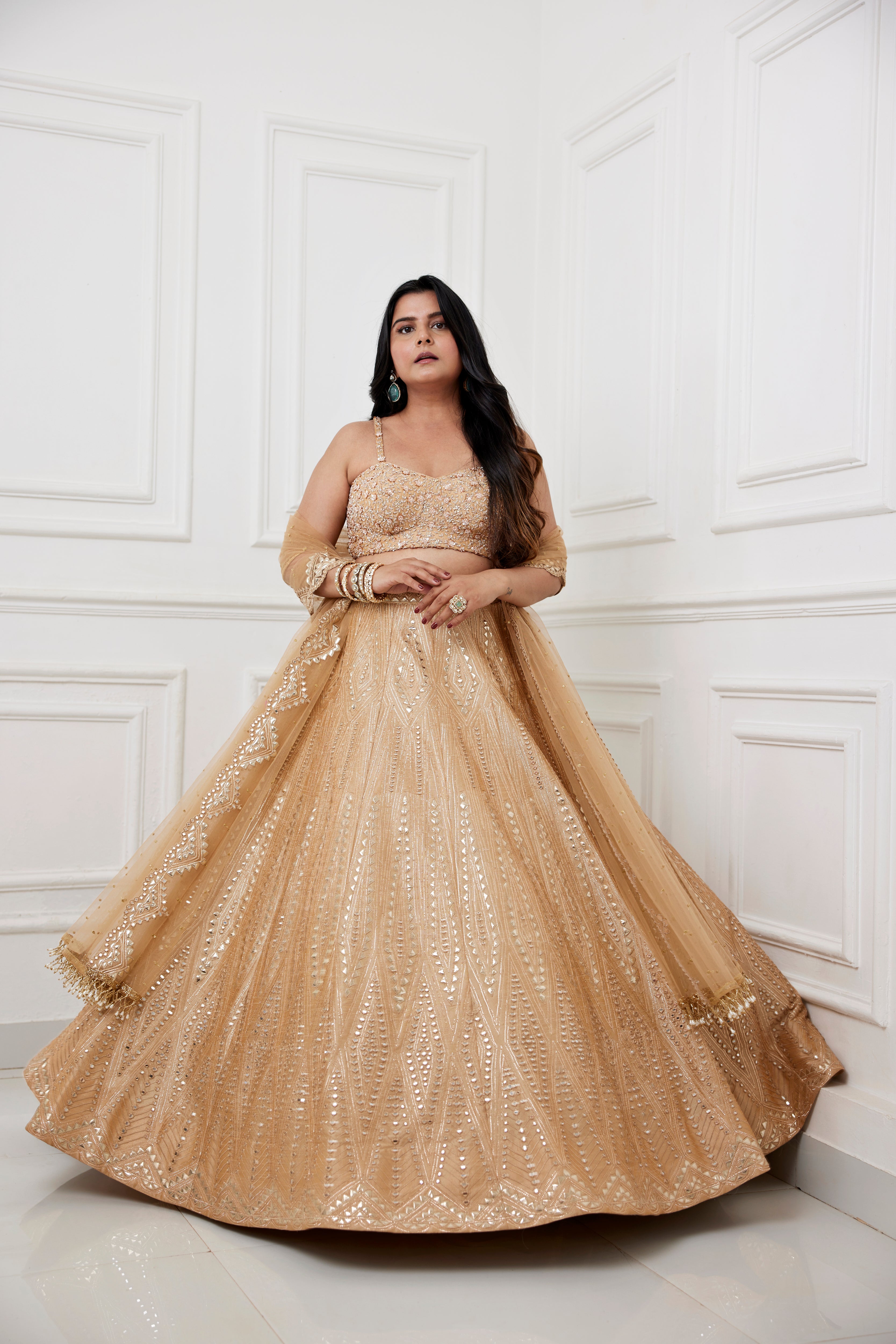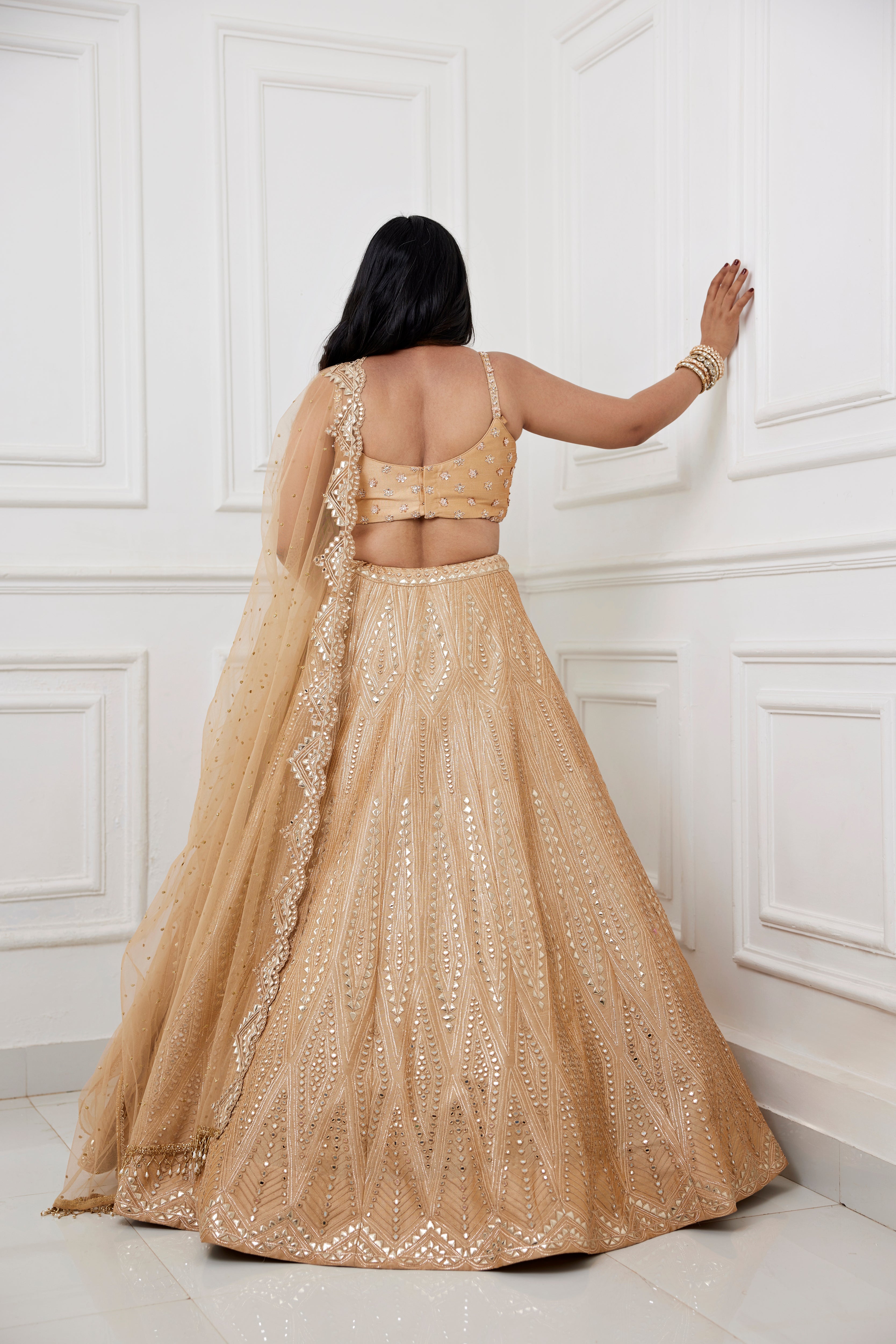 Gold geometric mirror and leather applique embroidered skirt in dupion silk paired with a spaghetti blouse and tulle dupatta with scallop border and pearls, cutdana and sequence detailing.