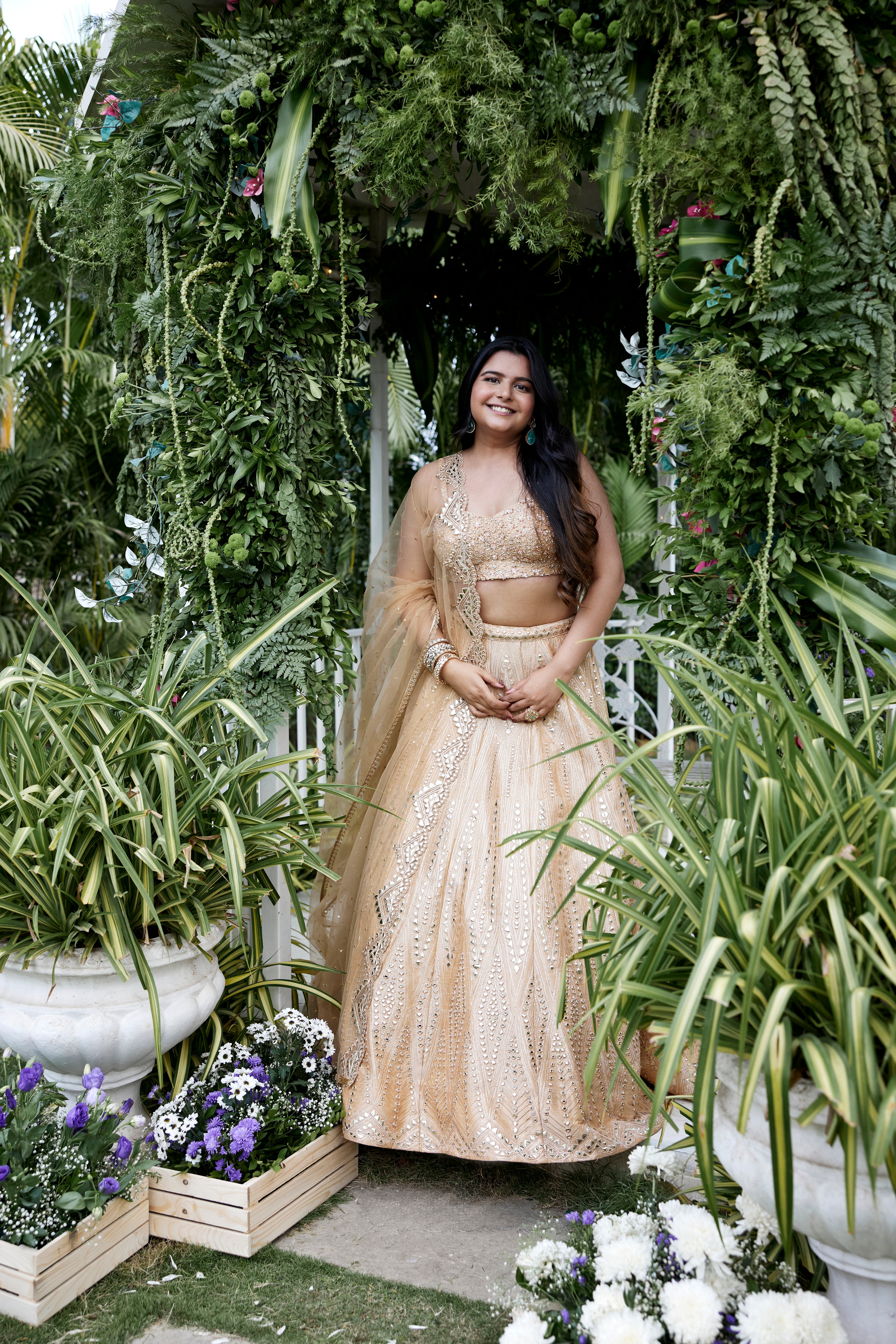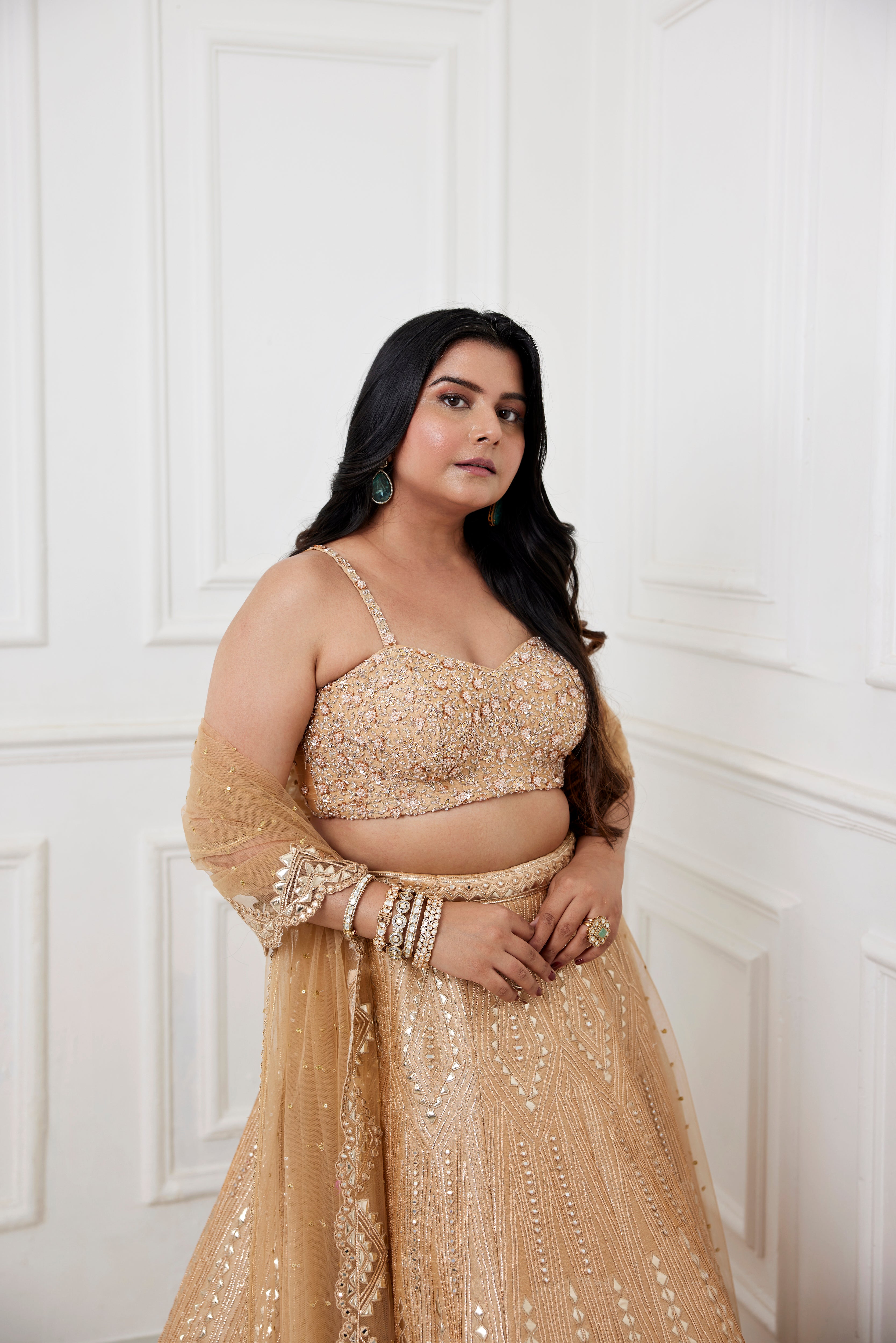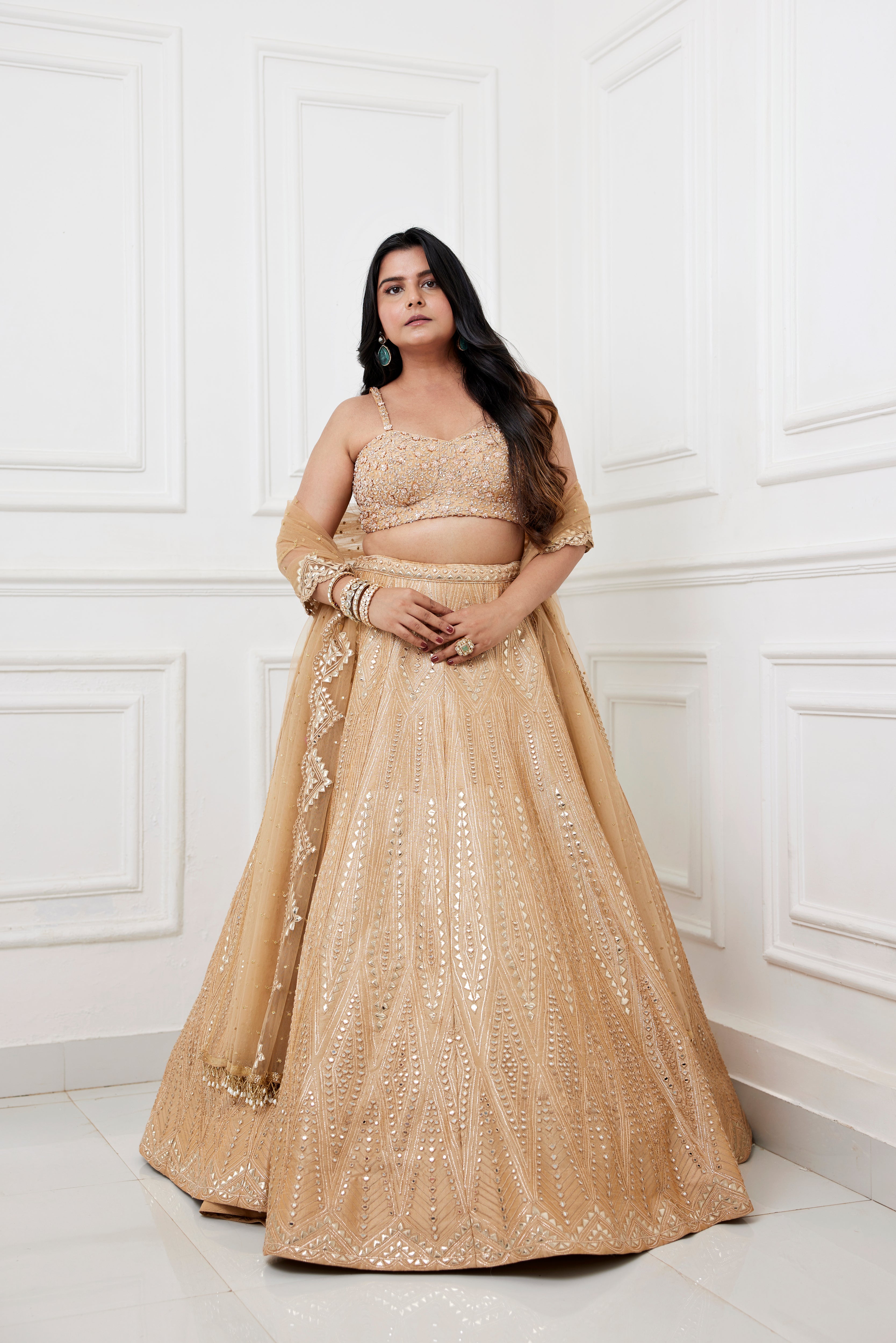 Gold geometric mirror and leather applique embroidered skirt in dupion silk paired with a spaghetti blouse and tulle dupatta with scallop border and pearls, cutdana and sequence detailing.