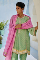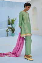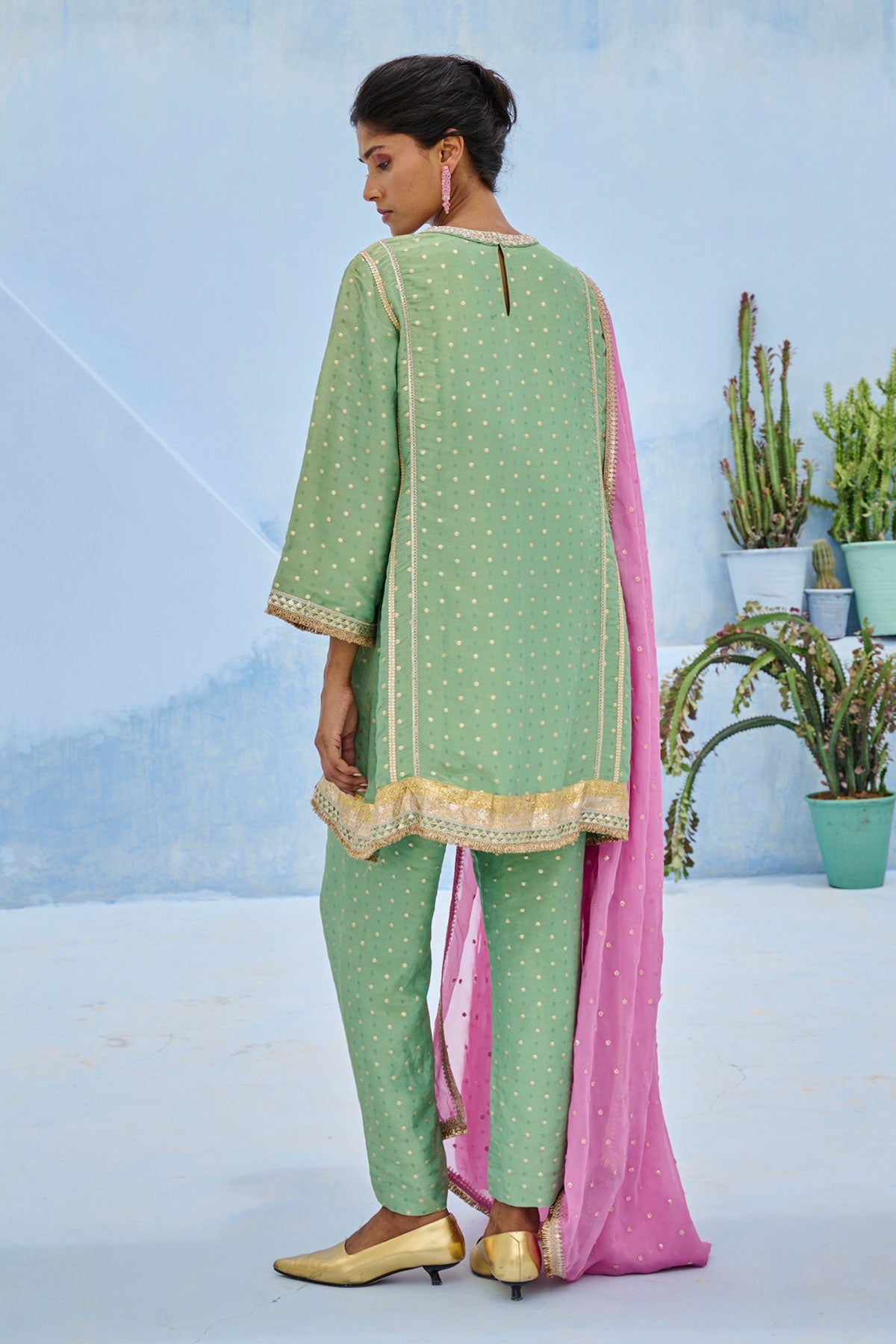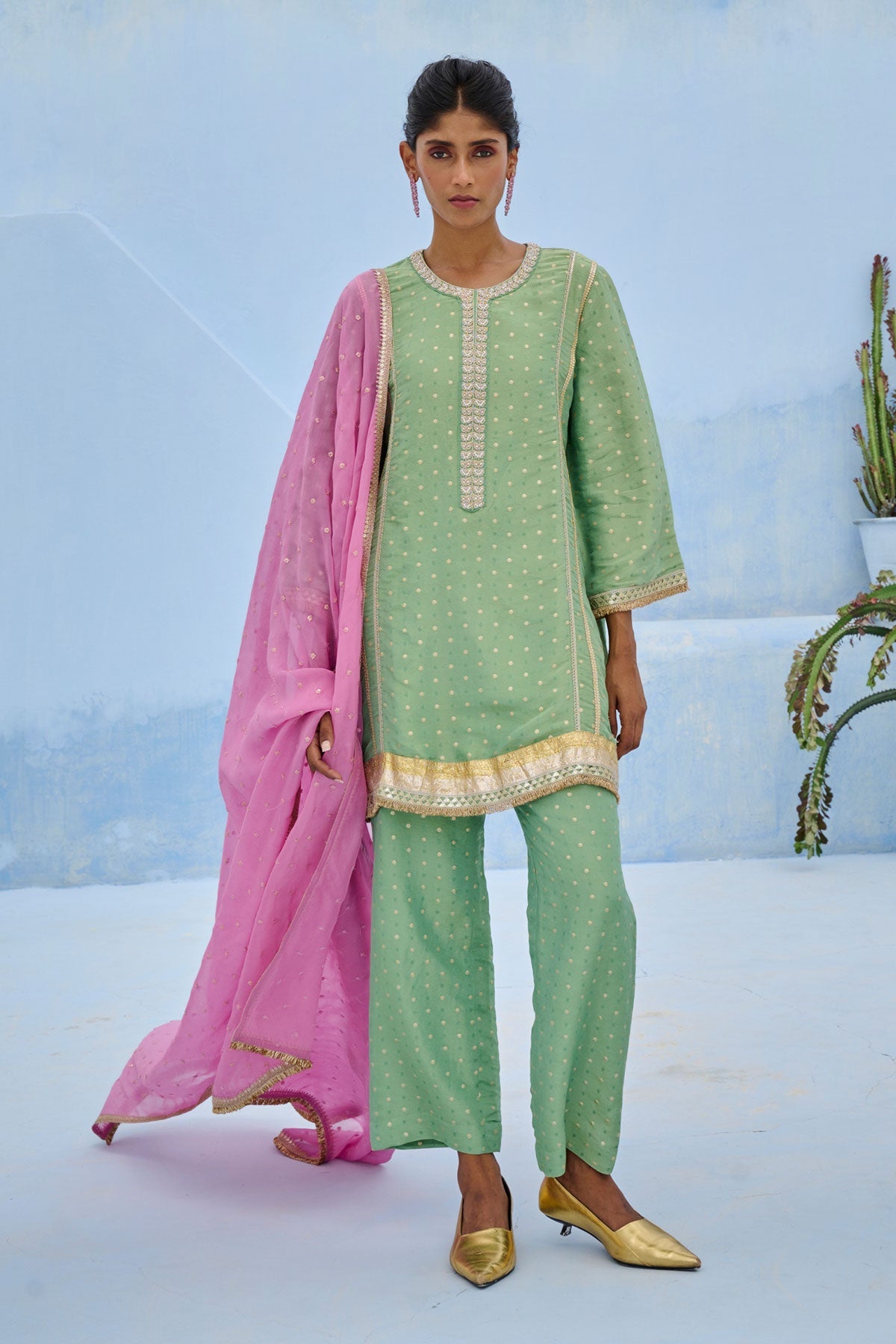 Tissue brocade polka woven pants paired with glassbeads embroidered neckline kurta with gota work lace and contrast organza dupatta.
