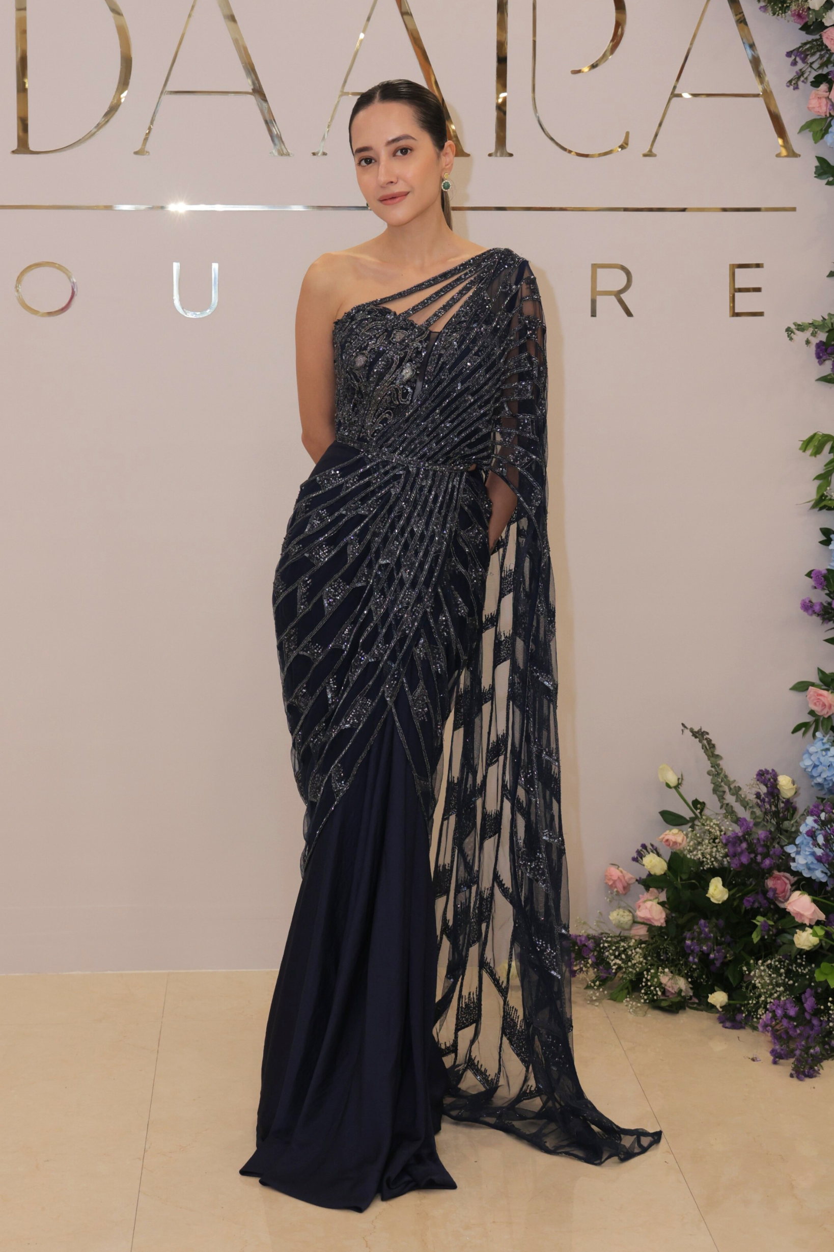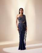 Midnight Blue drizzle embroidery saree with delicately sculpted silhouette and gleaming linear embroidery.