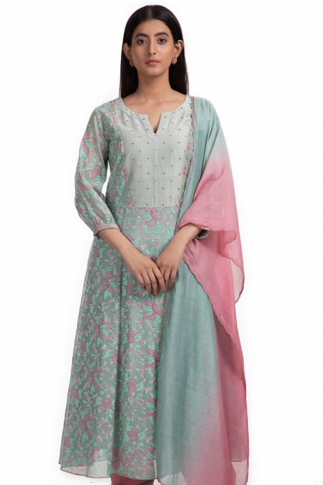 A Mint block printed handwoven Chanderi kurta, paired seamlessly with a Pink cotton salwar, offering both comfort and style. The ensemble is beautifully completed by a Pink Ombre pure Silk Chanderi dupatta, adorned with delicate hand embroidery that adds a touch of opulence.