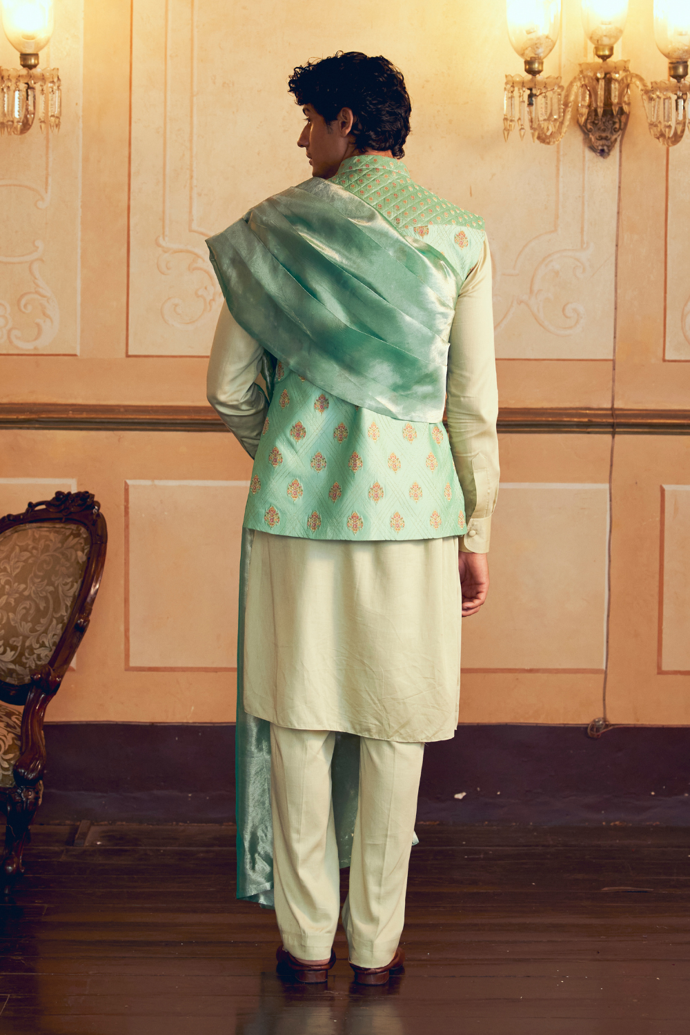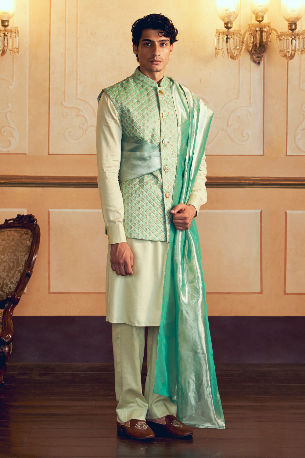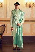 This classic Mint Green Jacquard Banarasi men's jacket set, quilted with silk zari and adorned with semi precious meenakari buttons, is paired with a mint green silk cotton kurta and pants, completed by a matching silk zari tissue dupatta drape, blending opulence with simplicity.