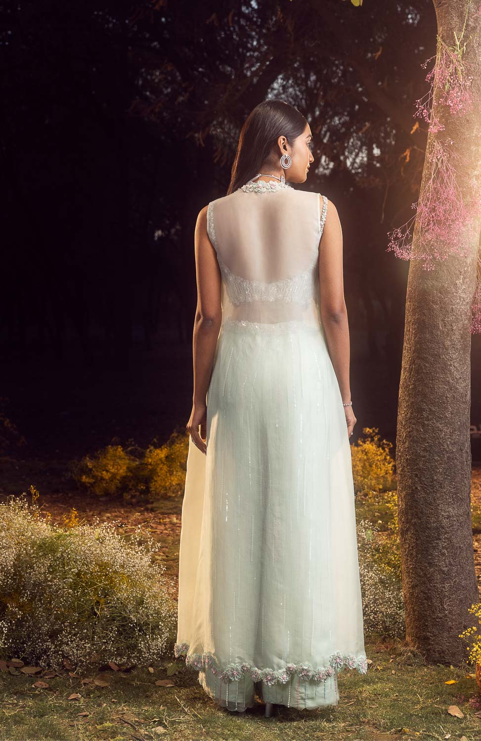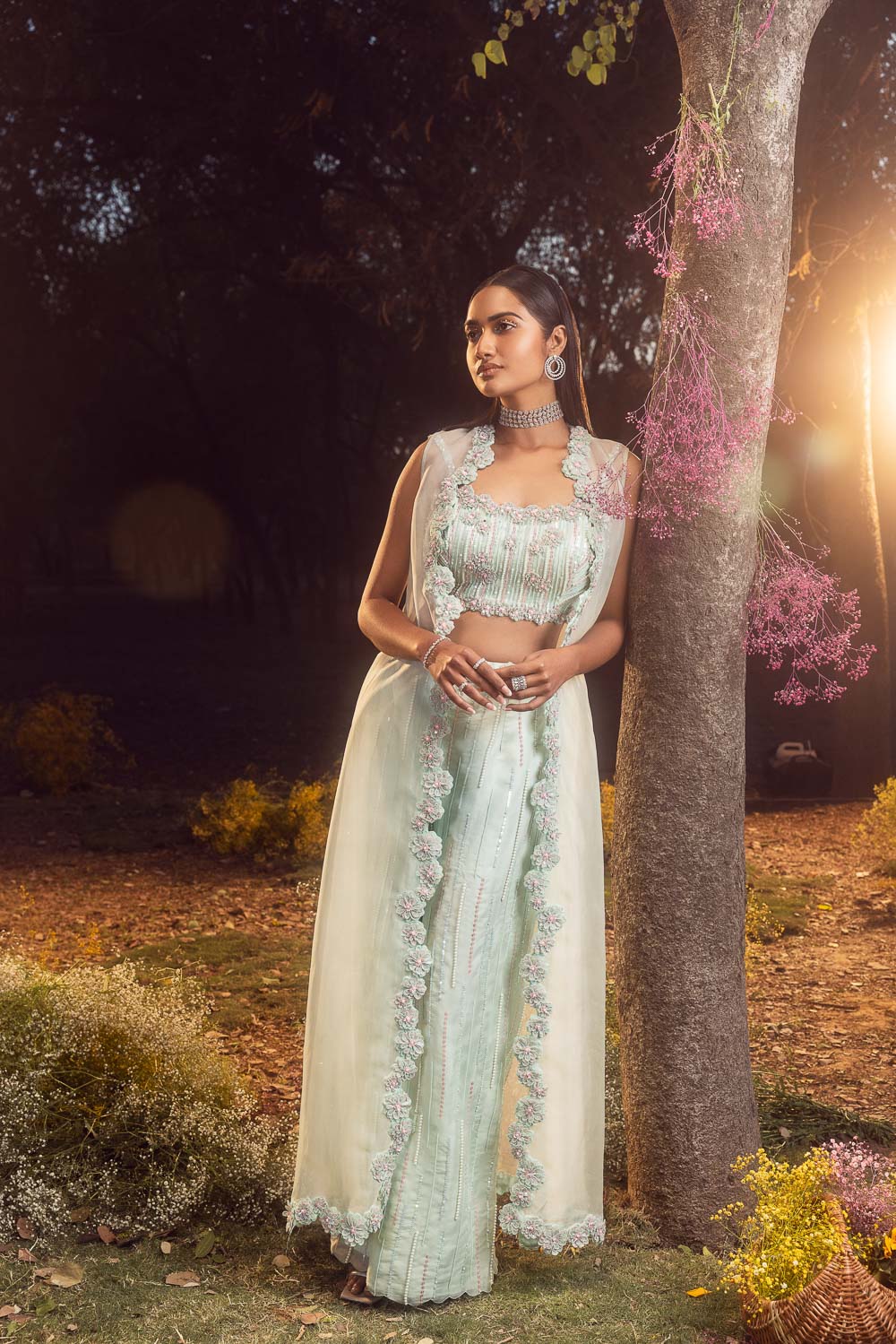 Mint green organza trousers and jacket with a pleated crop top intricately embroidered in a floral pattern with beads, sequins, pearls and crystals