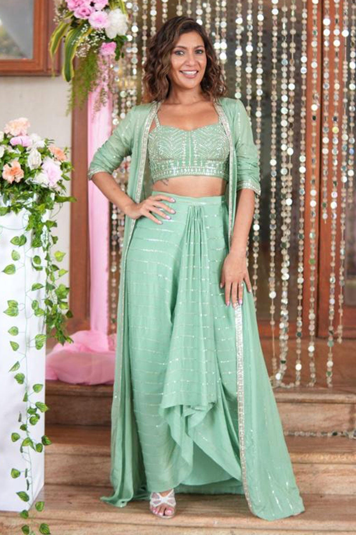 Glass bead and zardozi blouse paired with georgette drape skirt and cape.
