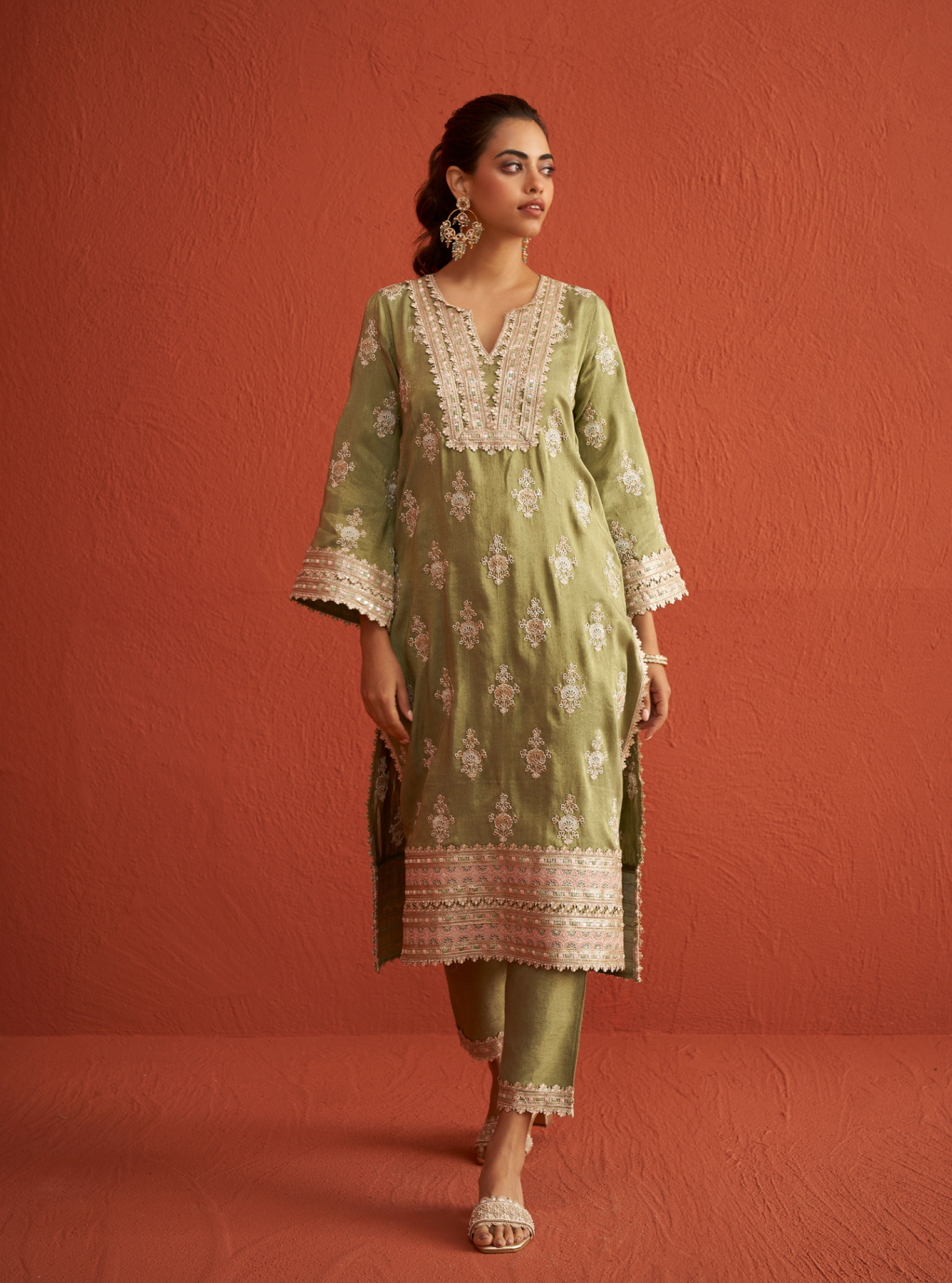 Contact Us For CustomizationThis elegant kurta set features a soft sage-green kurta adorned with delicate embroidery in white and gold thread. The intricate designs on the fabric add a subtle yet luxurious touch, creating a refined and timeless look. The notched neckline is adorned with multiple layers of gotta, which is mirrored on the sleeves and hemline. The kurta is paired with a pair of straight bottoms that feature the same gotta detail at the cuff. Finish the ensemble with a pastel pink dupatta, beautifully embellished with light embroidery, complementing the kurta's design. Perfect for festive occasions, this kurta set exudes a sophisticated charm.