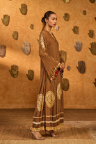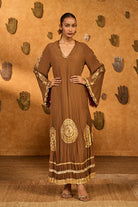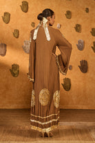 Details: A rich mocha-colored kaftan, featuring a moonfish print on the bottom half and adorned with silver and gold lumpi detailing. The crushed texture adds depth and movement, giving the piece an effortlessly elegant appeal.