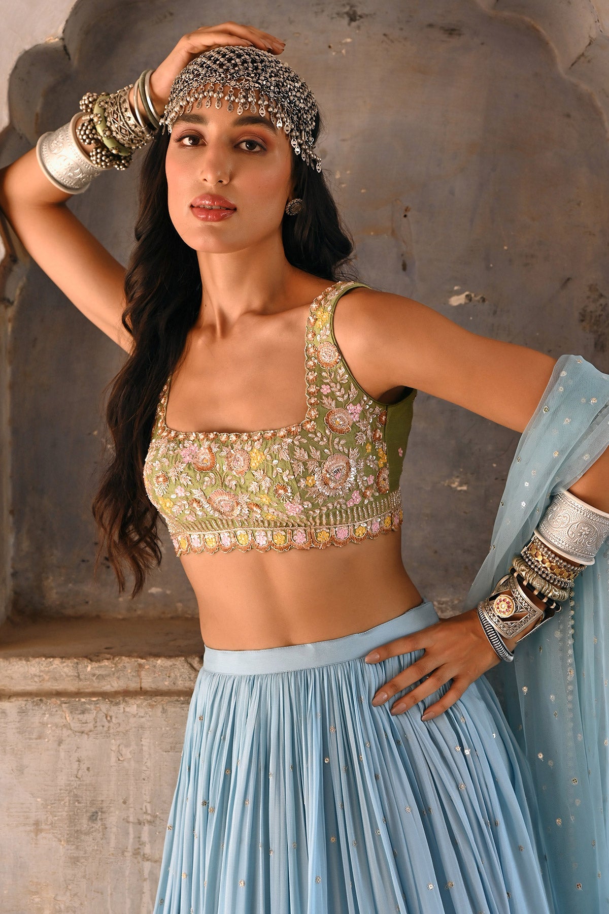 Resham zardozi and glassbeads embroidered blouse with shaded georgette skirt and tulle dupatta.