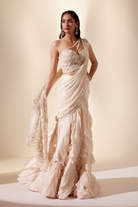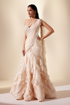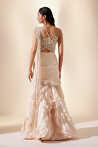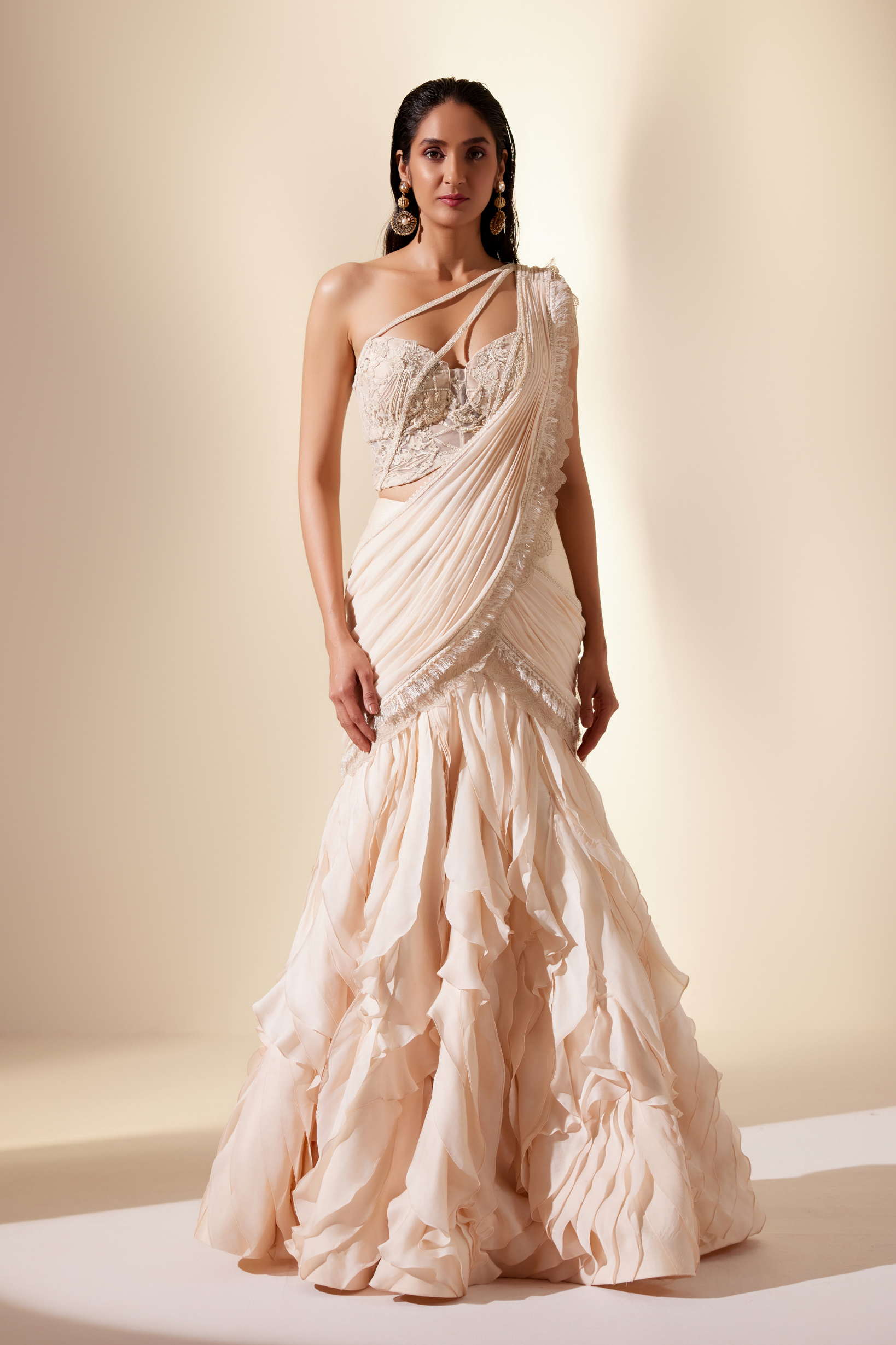 The saree comes with alluring organza drape and blouse detailing that shimmers like moonbeams cascading through a starlit sky.