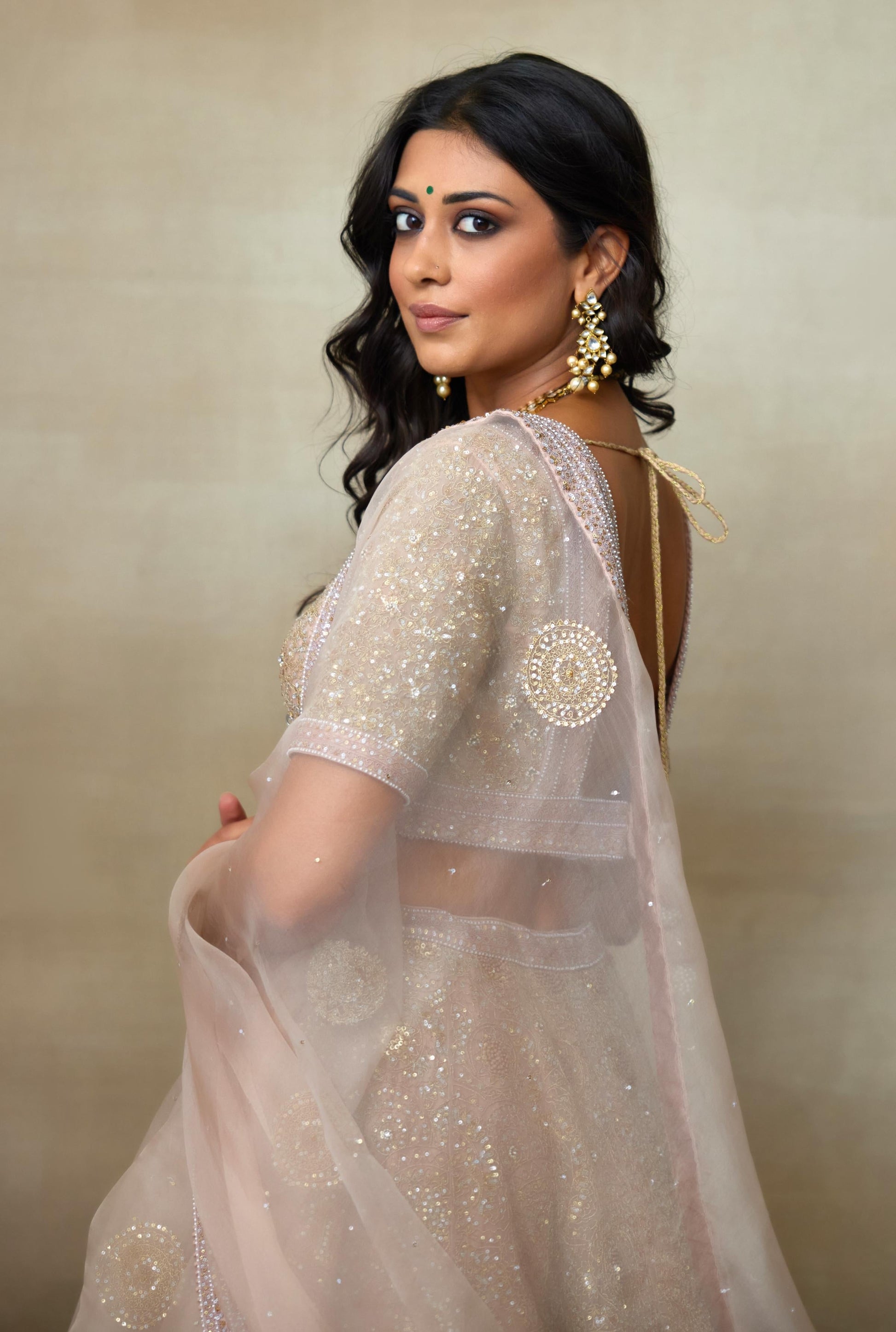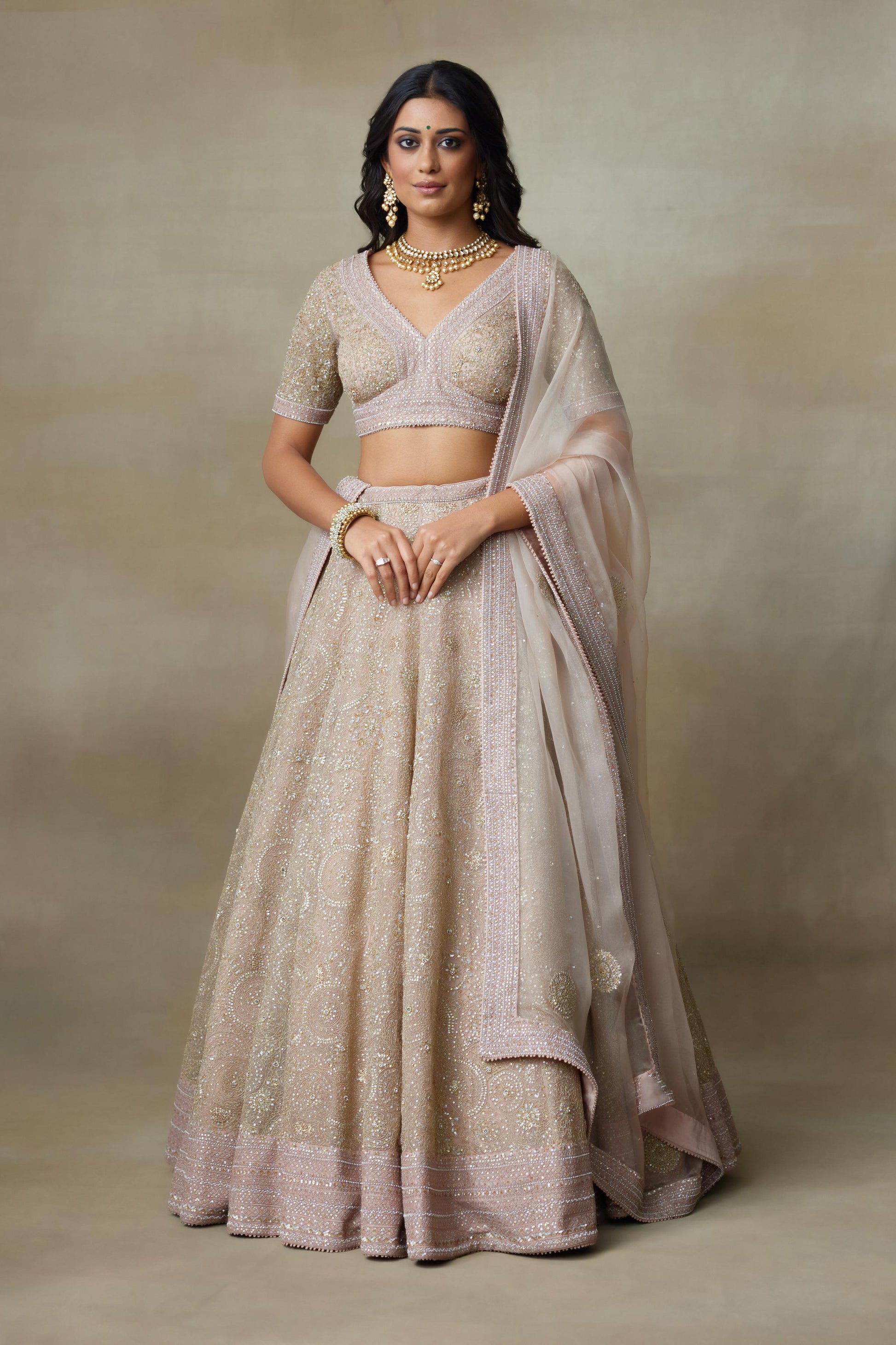 Our Silk Organza rose And Nude Colour Lehenga Paired With Chamundi Silk Blouse And Organza Dupatta Has Work Of Swaroski And Sequence Work In Golden Colour With Mandalas In Between Making It A Enchanting Ensemble.