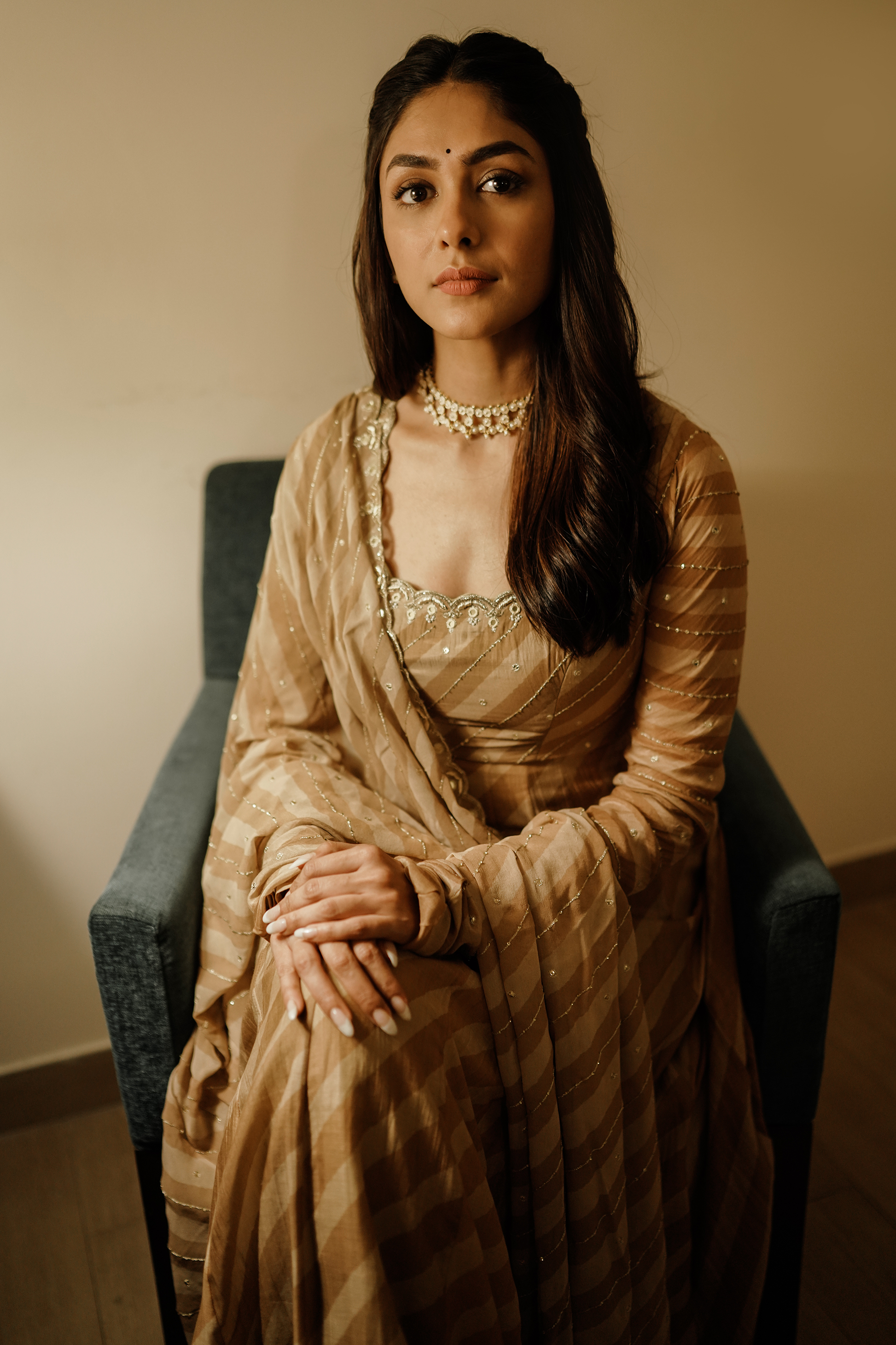 Mrunal Thakur looks elegant in a gorgeous beige anarkali with a hand–embroidered yoke and sleeves embellished with mirror, zari work, moti and sequins paired with scallop embroidered pants and dupatta.