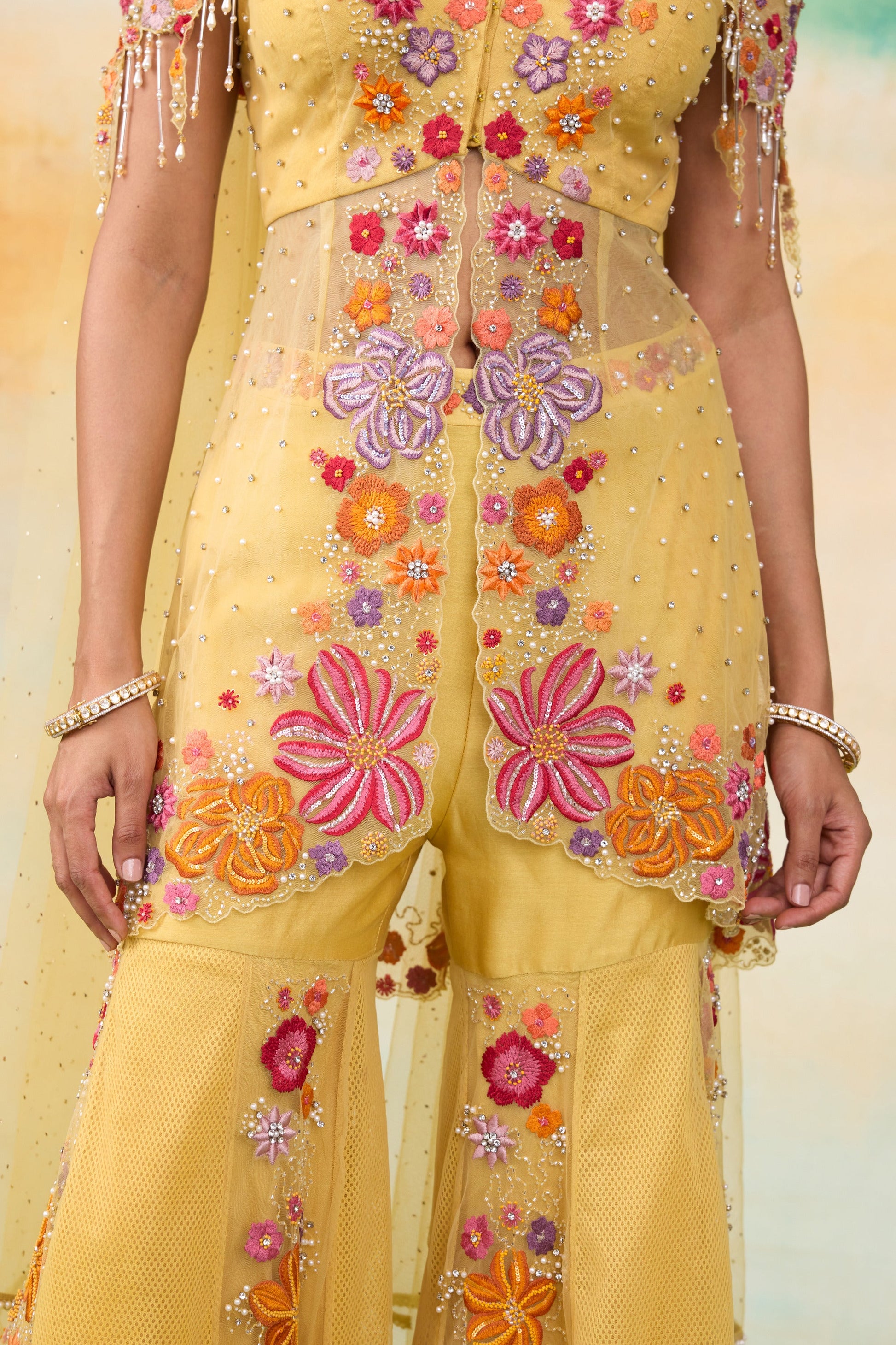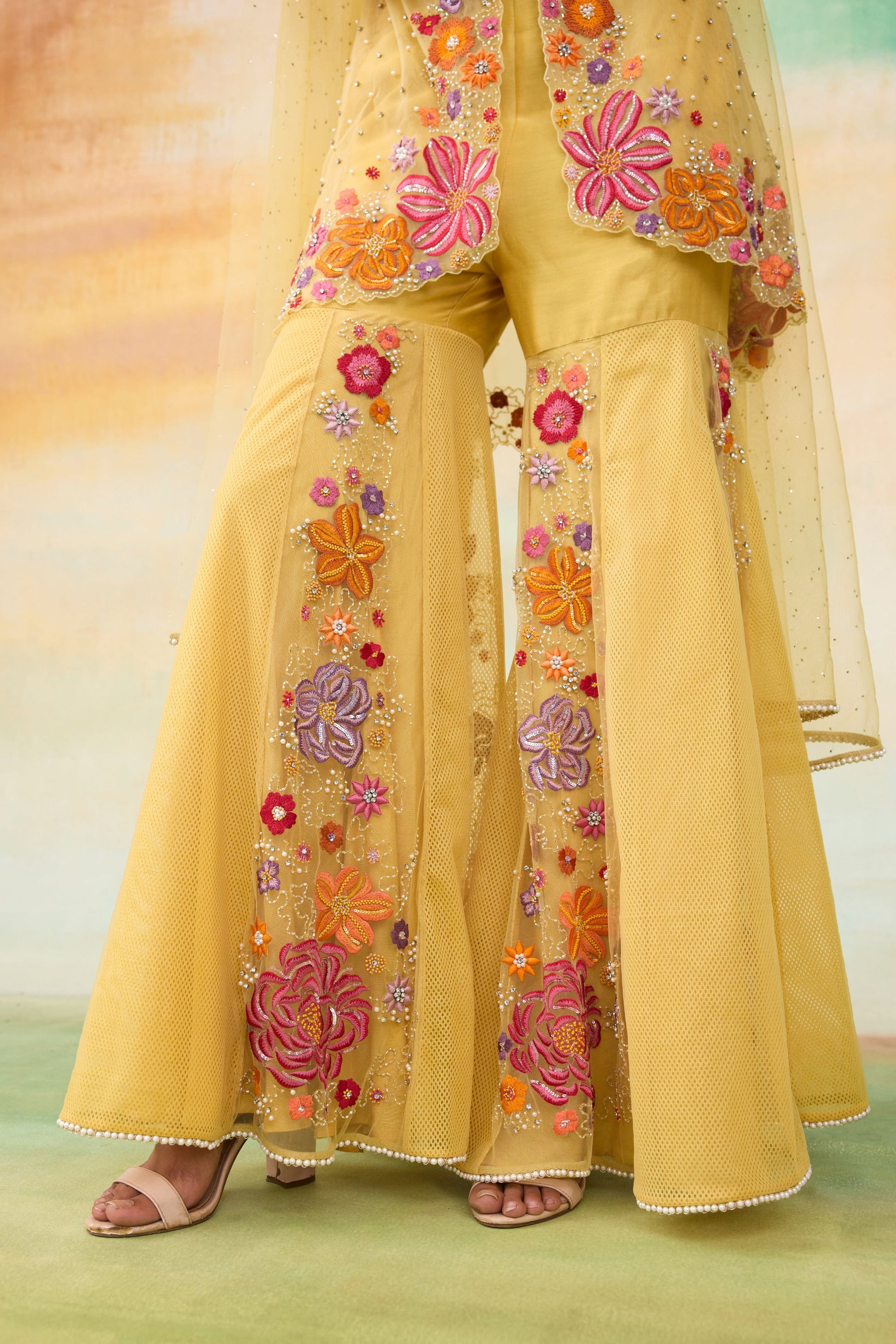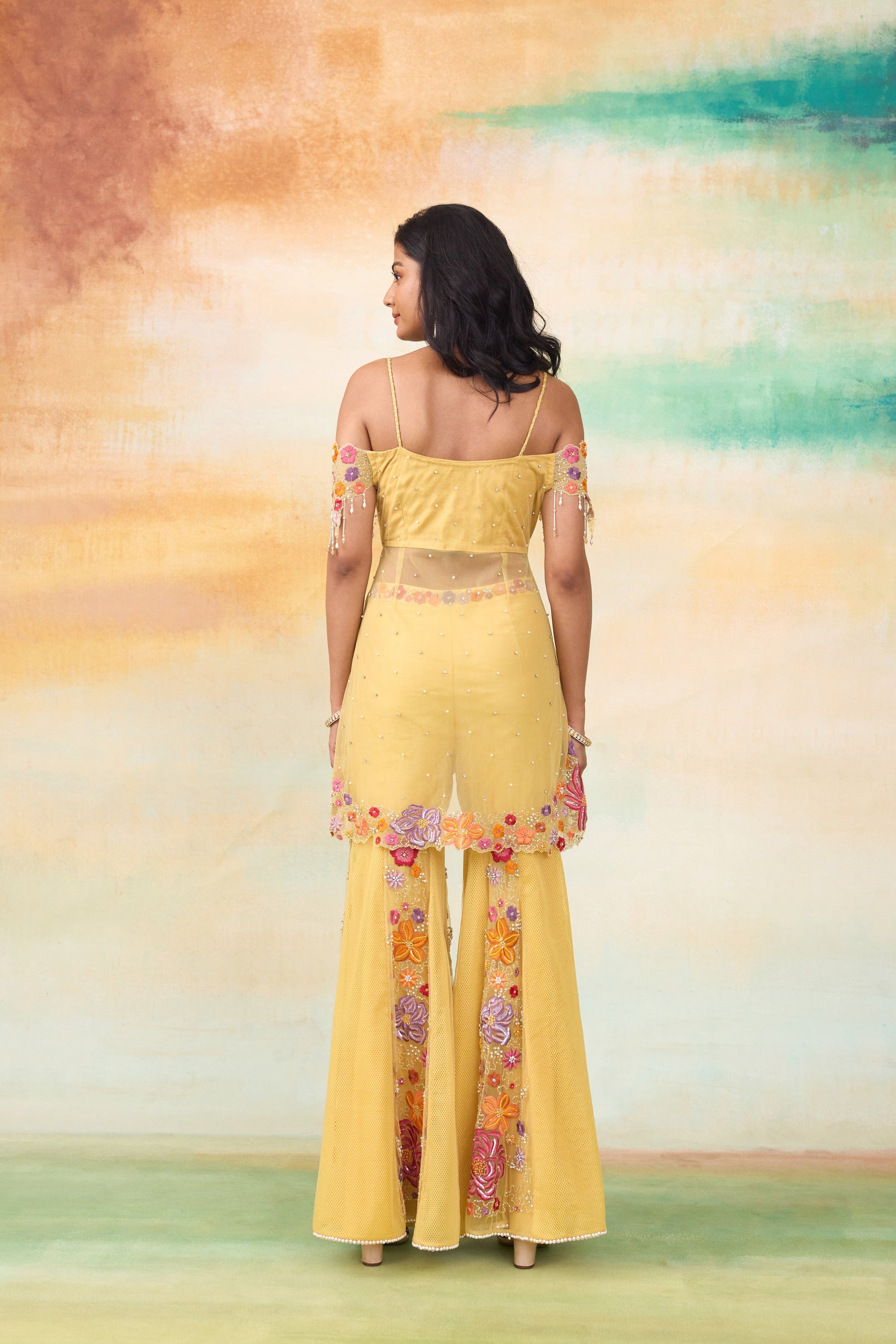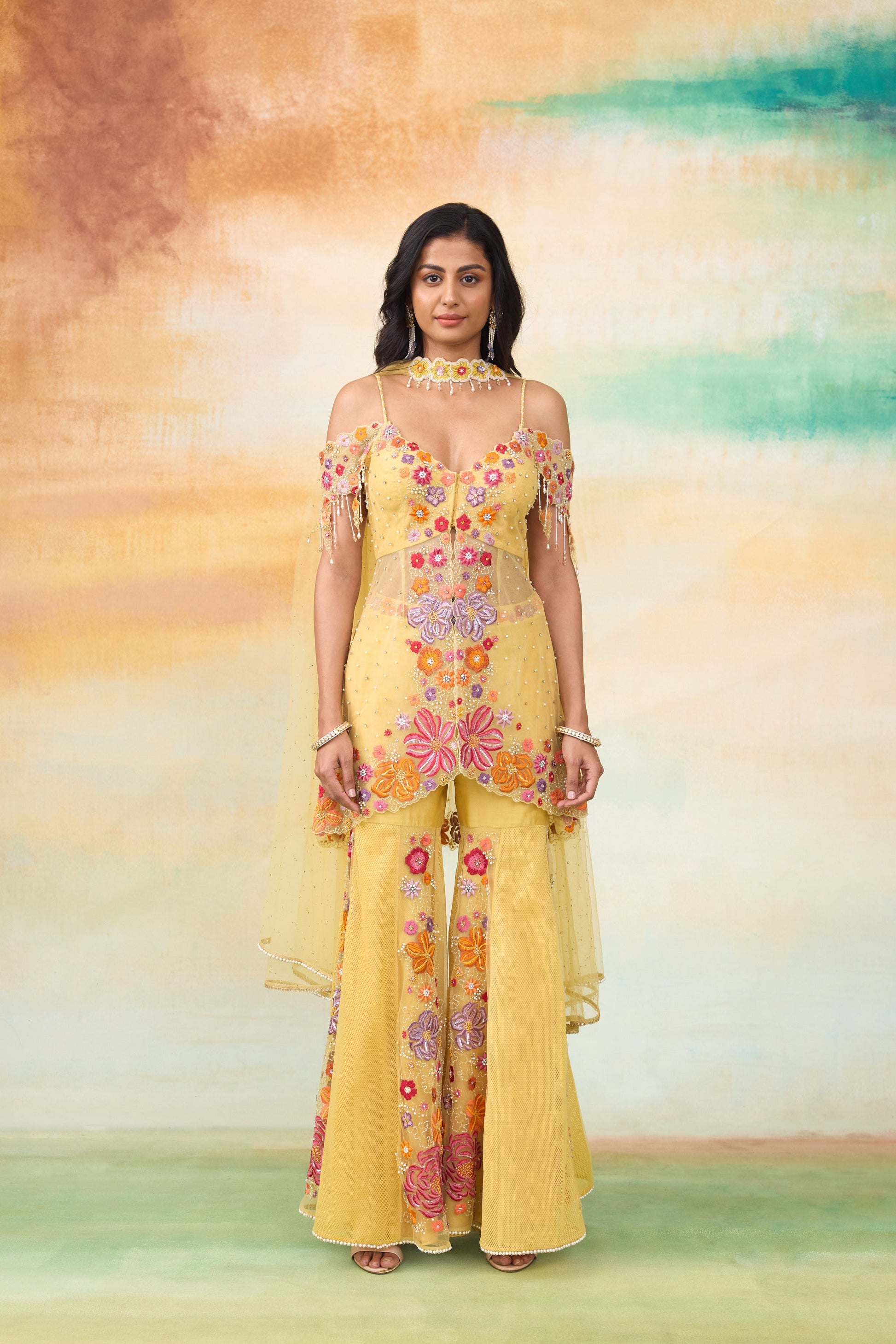 The Mulan sunrise yellow peplum gharara set is a mesmerizing blend of elegance and artistry . This stunning ensemble features a hand embellished peplum top, adorned with a captivating mix of micro to oversized colorful floral morifs and intricate handwork. The design is elevated with shimmering pearls, delicate cutwork detailing, dazzling sequined flowers, and graceful tone-on-tone tassels, exuding timeless sophistication. Paired with a beautifully crafted gharara and a floral cut choker style dupatta , this outfit radiates charm and is perfect for making an unforgettable statement.
