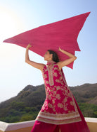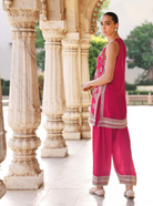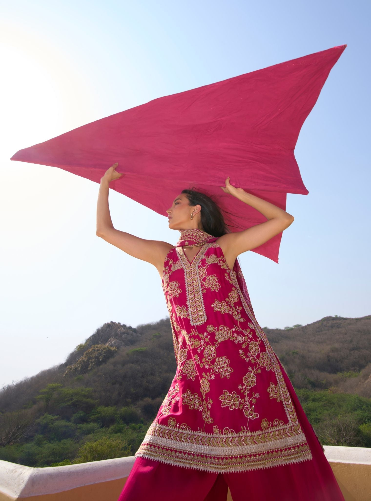 The Jivara Kurta in Fuschia is the ultimate Rakhi stunner; lively, elegant, and loaded with intricate details. Cut in lightweight Bemberg Satin, the sleeveless kurta features tonal thread embroidery in floral bootis, detailed with delicate gota. The neckline and hem are framed with multi-panelled embroidered borders and tiny scalloped lace inserts. The straight-fit pants mirror the detailing at the cuff, creating a cohesive look. Paired with a scallop-edged organza dupatta embroidered with floral motifs and finished with lace trims; this one's a bold pick for golden hour gatherings and day-long festivities.
