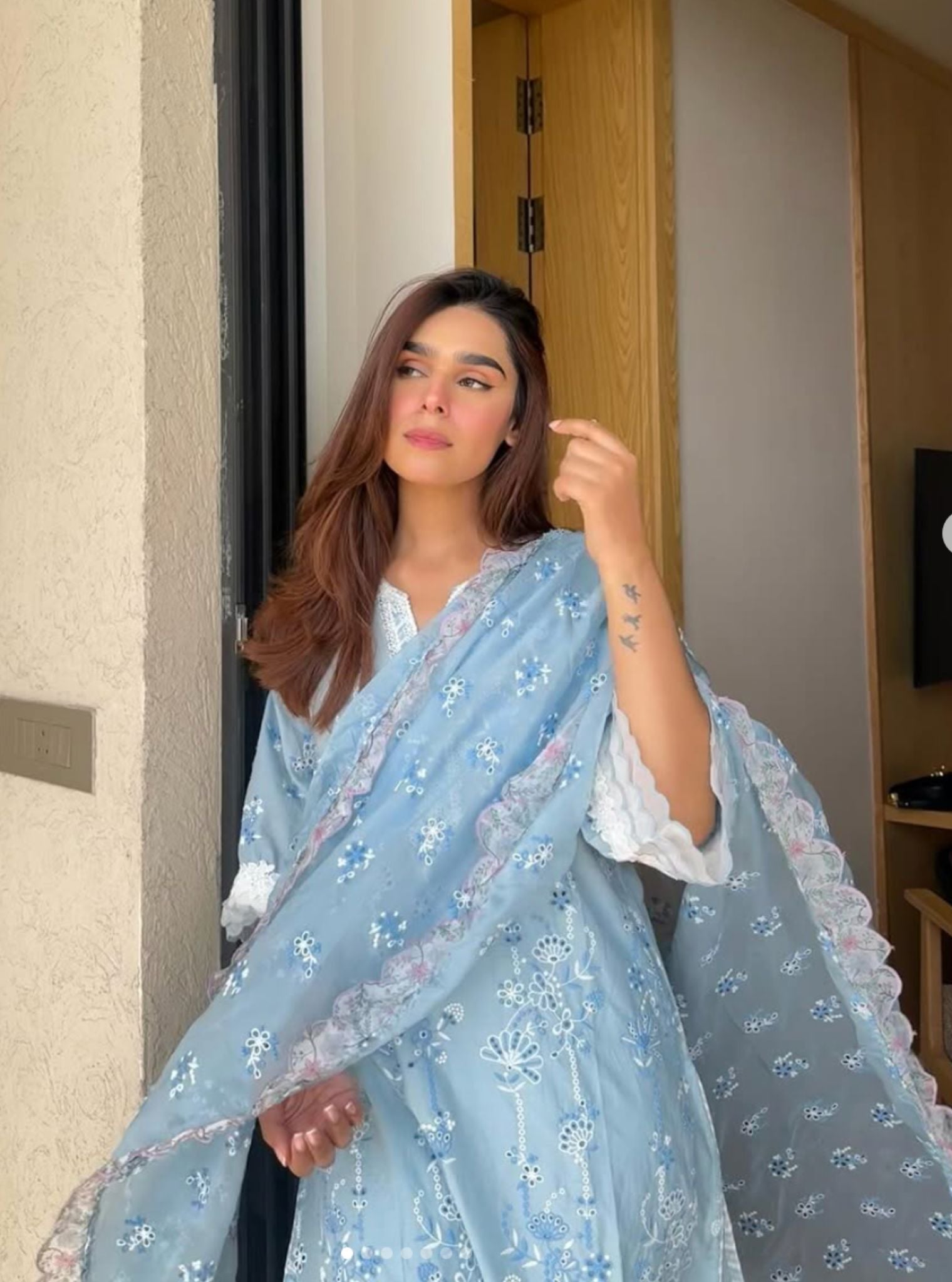 The matching straight-fit pants and the sheer dupatta, graced with subtle floral patterns and scalloped lace borders, completes the ensemble. Ideal for daytime gatherings or festive occasions, this kurta set captures the essence of understated luxury and effortless style.
