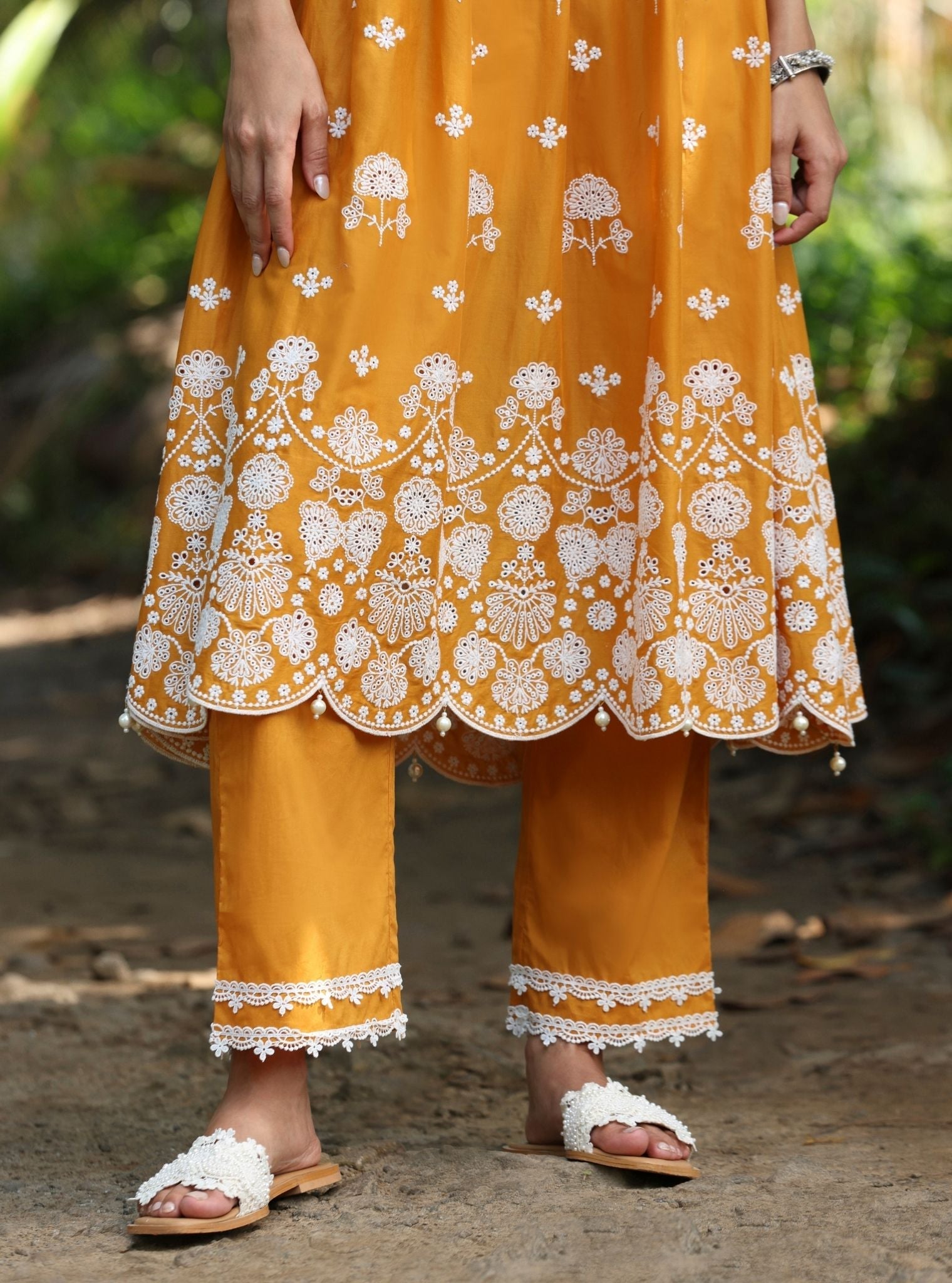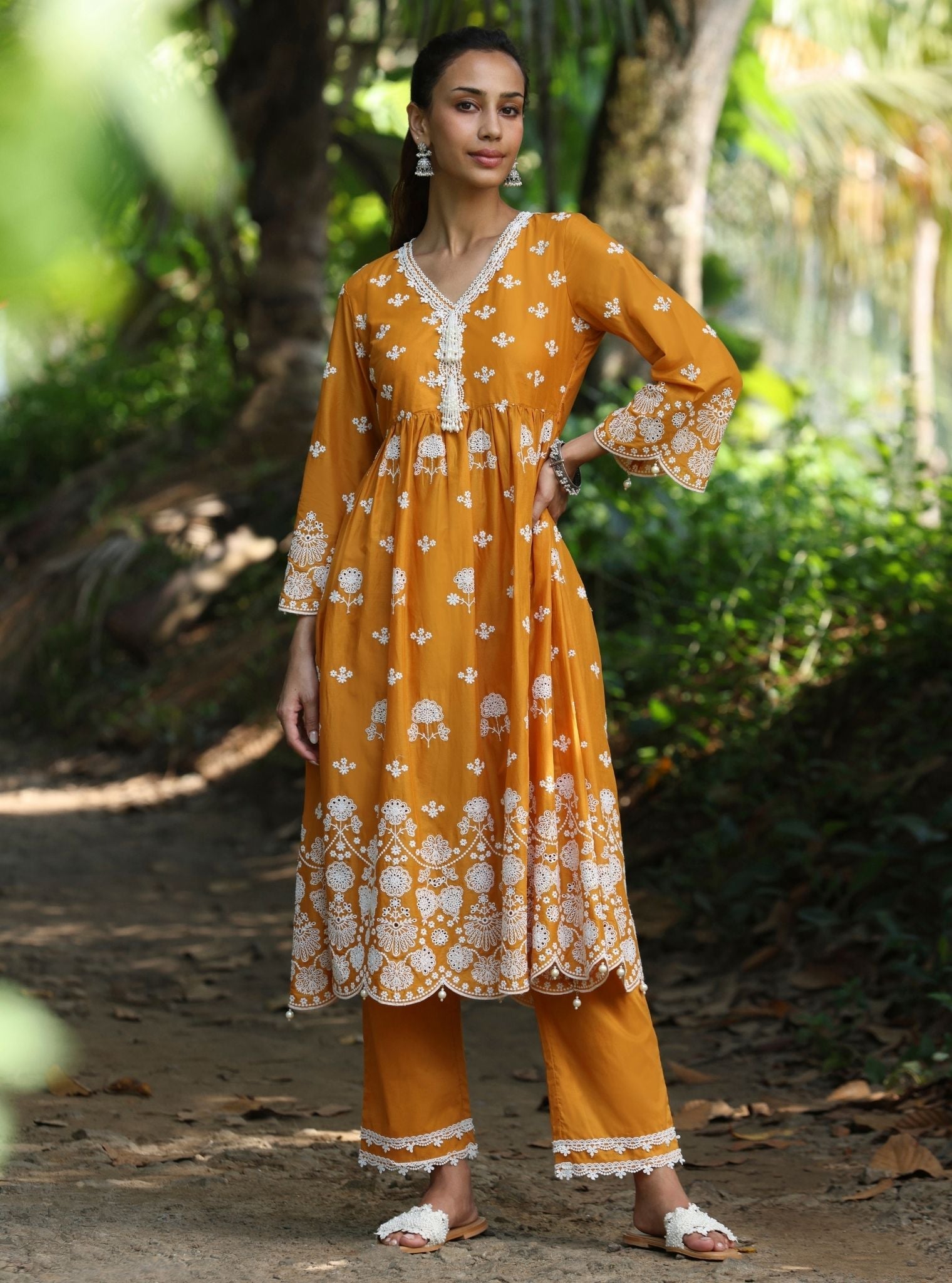 Step into summer with this radiant orange cotton Anarkali set - a celebration of vibrant hues and breezy comfort. The Anarkali, crafted from soft and breathable cotton, features intricate white thread embroidery, bringing a refreshing contrast to the warm base. The V-neckline and scalloped sleeves are adorned with delicate lace accents and embroidery. The empire waistline flows into a flared hem, ensuring ease of movement and a flattering fit for sunlit gatherings.