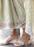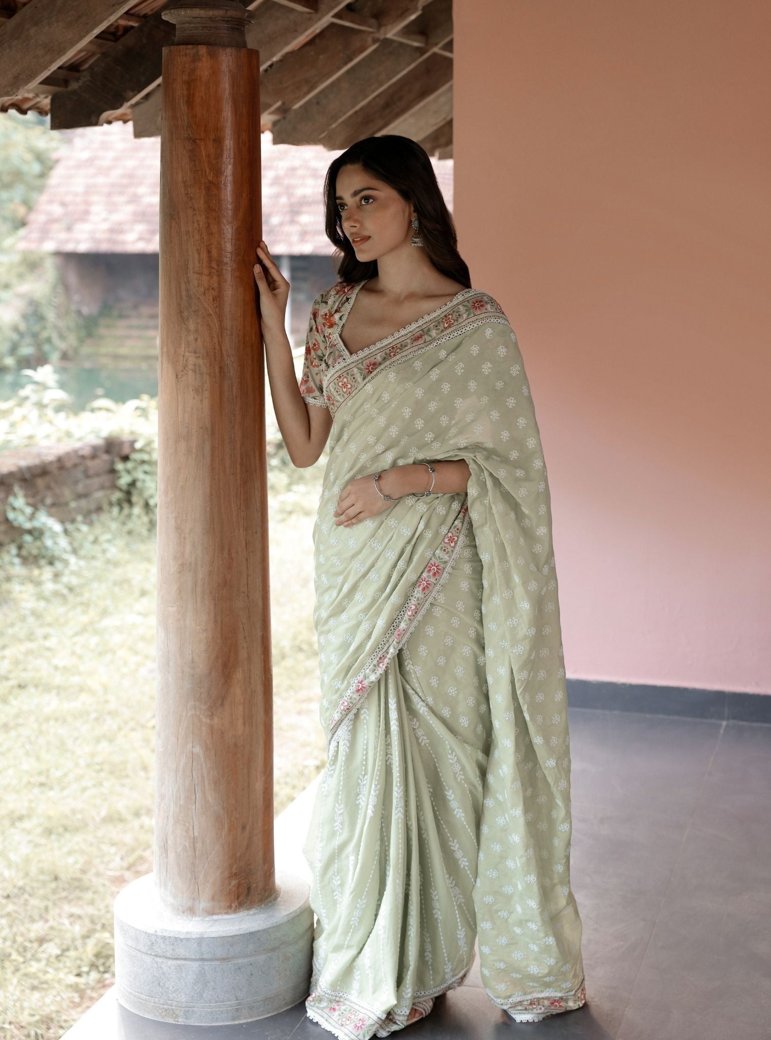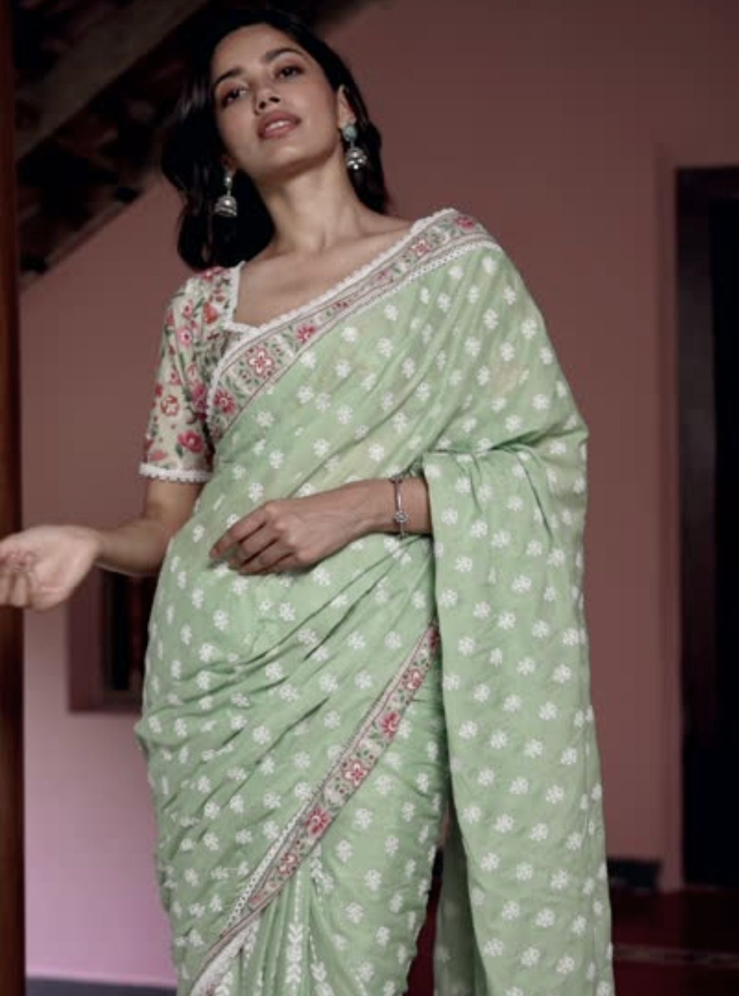The saree features delicate embroidery in white thread, and the border is adorned with fine white lace, creating a delicate contrast. This saree is perfect for daytime festivities, intimate gatherings, or summer soirees