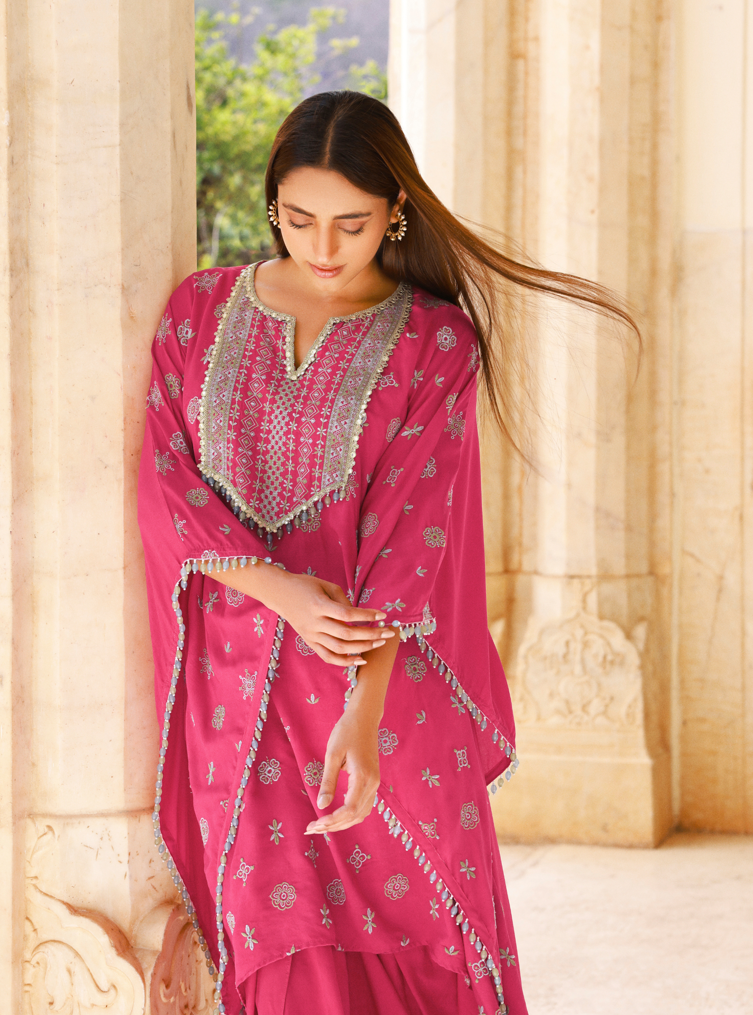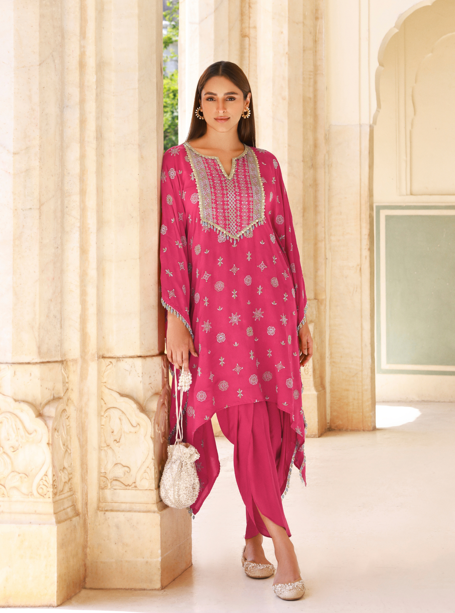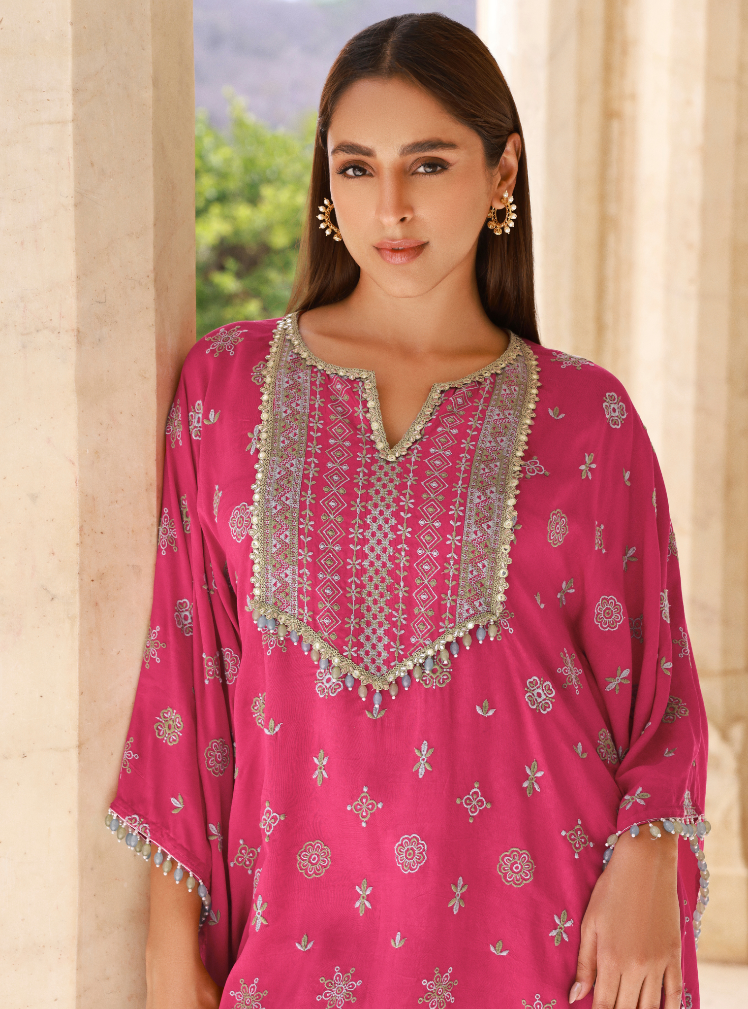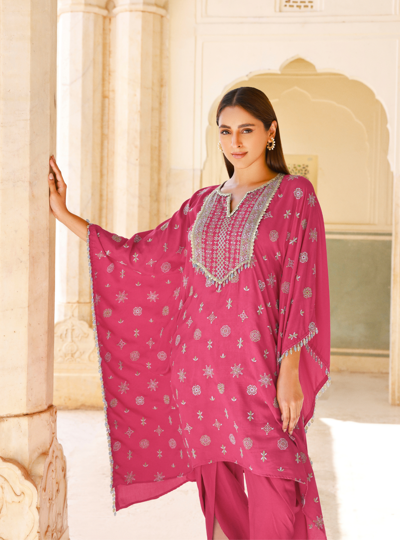 The Dovira Kaftan Set in bold fuschia is where festive fun meets effortless style. Designed in a relaxed silhouette, the kaftan features delicate thread embroidery along the neckline and front, with playful lace detailing at the edges. Keeping the fit easy and flowy.