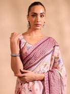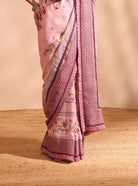 ?ÿAn embodiment of grace, this blush pink saree is a poetic blend of delicate florals and intricate prints. Crafted from a lightweight fabric that drapes effortlessly, the saree features soft floral motifs scattered across its body and border. The contrasting dark embroidered?ÿ border creates a striking balance between tradition and modernity.