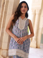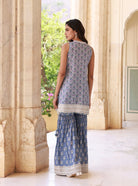 The Divaya Denim Kurta Set pairs Mughal-inspired prints with a contemporary silhouette. The sleeveless lawn kurta features a deep V-neckline embellished with thread and mirror embroidery, framed by lace borders. Paired with a voluminous sharara-style pant in matching print and tonal detailing at the hem, the look is full of movement. A printed organza dupatta in soft blue tones with scalloped lace completes this fresh take on festive dressing.