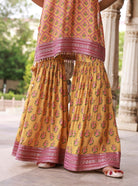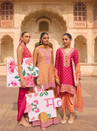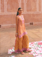 The Divaya Denim Kurta Set pairs Mughal-inspired prints with a contemporary silhouette. The sleeveless lawn kurta features a deep V-neckline embellished with thread and mirror embroidery, framed by lace borders. Paired with a voluminous sharara-style pant in matching print and tonal detailing at the hem, the look is full of movement. A printed organza dupatta in soft yellow tones with scalloped lace completes this fresh take on festive dressing.