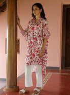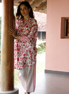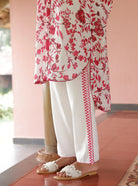 This breezy and contemporary kurta set is a perfect pick for casual, laid-back summer days. The kurta is designed on a fresh white base, featuring bold fuchsia floral prints that create a visually striking contrast. The intricate blooms in shades of fuchsia and red aare both elegant and calming, bringing a serene vibe to the piece.