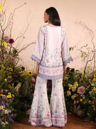 This pastel-hued kurta set is an embodiment of soft elegance and breezy summer vibes. The pristine white base is beautifully adorned with dainty floral prints in shades of pink, lavender, and green, evoking the serene beauty of a blooming garden. The kurta features an intricately ornate yoke with lace detailing along the sleeves and hemline. The kurta is paired with flared pants that create a flowy silhouette, making it a versatile ensemble for both casual outings and semi-formal events. The matching dupatta, with its stripes and floral accents, adds a delicate touch of femininity, creating a cohesive, elegant look.