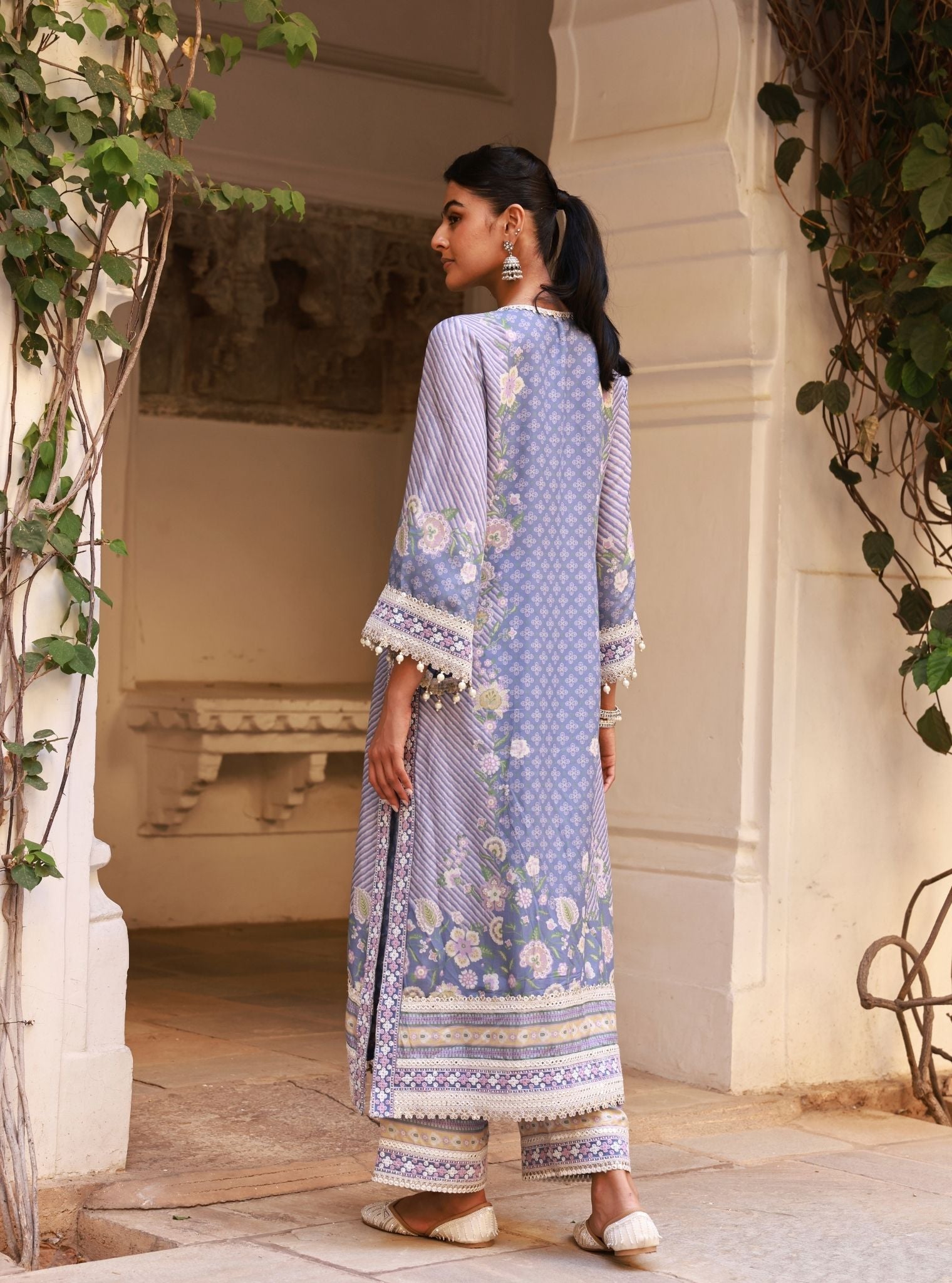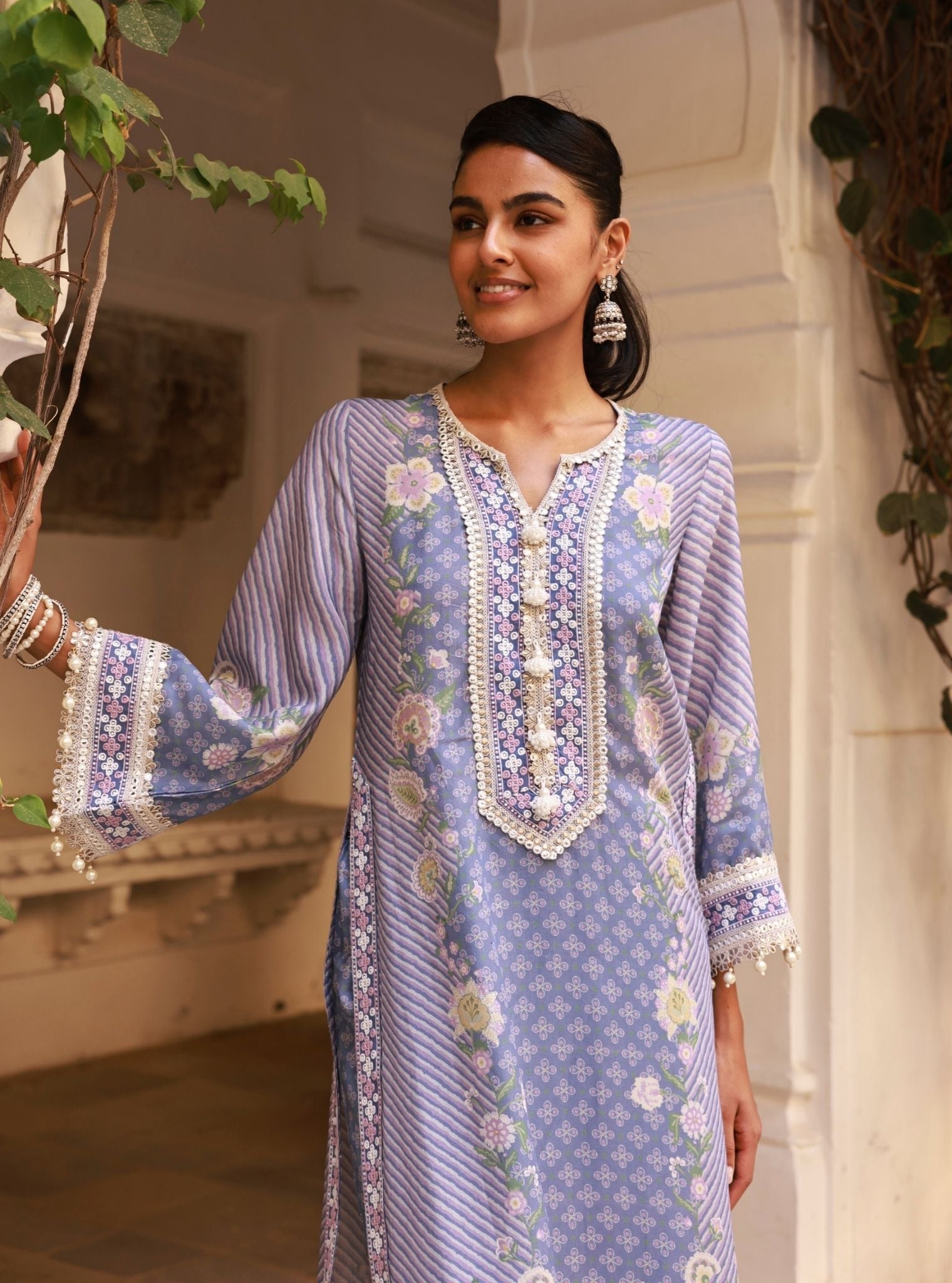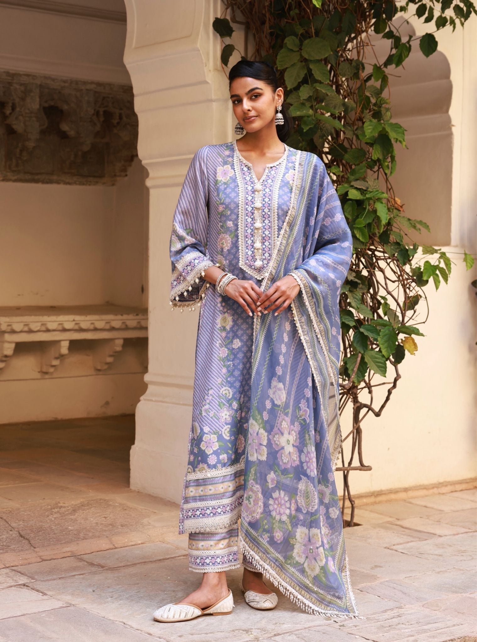 Cool and composed, the Olisha Denim Kurta Set is crafted in soft lawn fabric and printed with floral vines, dainty trellises, and striped panels. The kurta features a mirror-embellished neckline and a relaxed straight silhouette, making it a breeze for warm festive days. Sleeves are detailed with contrast borders and delicate lace, finished with beaded tassels for that extra something. Paired with matching lawn pants and a sheer organza dupatta featuring digital florals and scalloped lace borders, this set is light, easy, and effortlessly elegant.