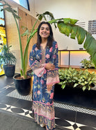 A canvas of deep midnight blue comes alive with a garden of blooming florals in this elegant three-piece kurta set. The straight, relaxed silhouette of the kurta is highlighted with intricate printed florals creating a charming contrast to the rich base. The notched neckline is beautifully accentuated with delicate thread embroidery. Flared sleeves and an intricately embroidered hem with scalloped lace lend feminine finesse to the overall design. Paired with matching straight-fit trousers adorned with complementary prints, the look is refined yet effortless.