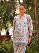 The Saurmi Co-ord Set in a calming blue hue brings together festive ease and everyday polish. The floral print top has a soft, feminine touch. Designed in a relaxed yet refined silhouette, it pairs perfectly with matching straight pants.