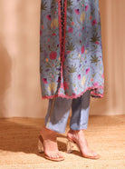 This floral kurta set brings together a refreshing palette and is a perfect addition to your spring and summer wardrobe. The soft blue base of the kurta is decorated with vibrant floral motifs in shades of pink, purple, and green, creating a lively yet serene aesthetic. The natural floral print brings a touch of nature's elegance to the piece, offering a versatile look that can be dressed up or down.