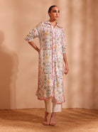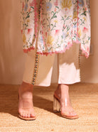 This floral kurta set is a perfect blend of understated elegance and playful charm, making it an ideal choice for spring and summer outings. The kurta features a pristine white base adorned with delicate floral prints in vibrant shades of pink, yellow, and green. The kurta is designed with a classic shirt collar and a button-down front, giving it a modern, yet timeless appeal. This piece is versatile enough for both formal and casual occasions. The delicate pink lace trim along the hemline and button placket adds a feminine and intricate detail, elevating the overall design.