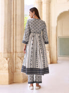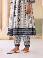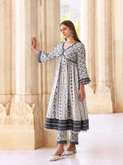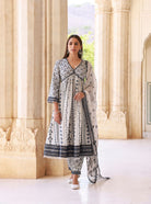 The Uvrita Anarkali Set captures timeless elegance in a soft shade of off-white, made for graceful celebrations. Crafted in sheer organza, the flowing silhouette is delicately embroidered with floral motifs along the yoke, sleeves, and flare; adding texture and quiet beauty to every detail. A V neckline with three-quarterth sleeves bring balance and softness to the look.