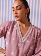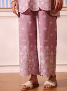Add a pop of colour to your spring-summer wardrobe with this lilac co-ord set blooming with intricate white thread embroidery. The kurta features a flattering V-neckline, relaxed sleeves, and a scalloped hemline; the playful floral embroidery is concentrated along the borders, offering a graceful finish that flows into the matching trousers.